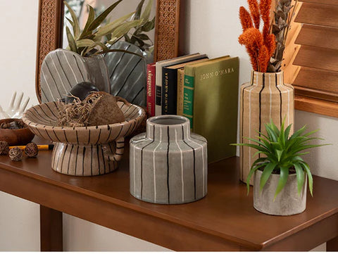 陶器の猫モチーフ傘立てや、ナチュラルなフラワーベースなど、玄関やリビングにアクセントを加える雑貨が多数ラインナップ。