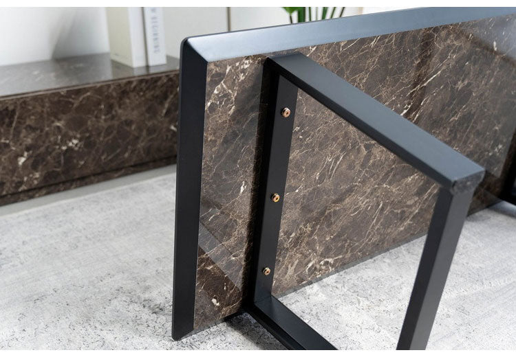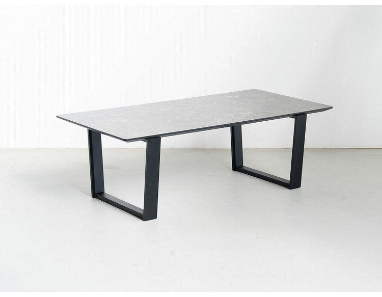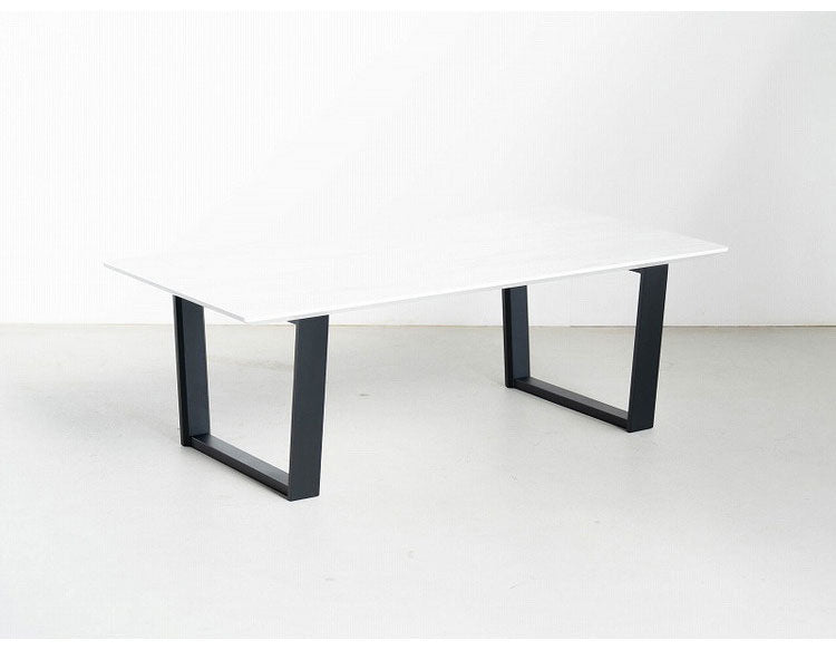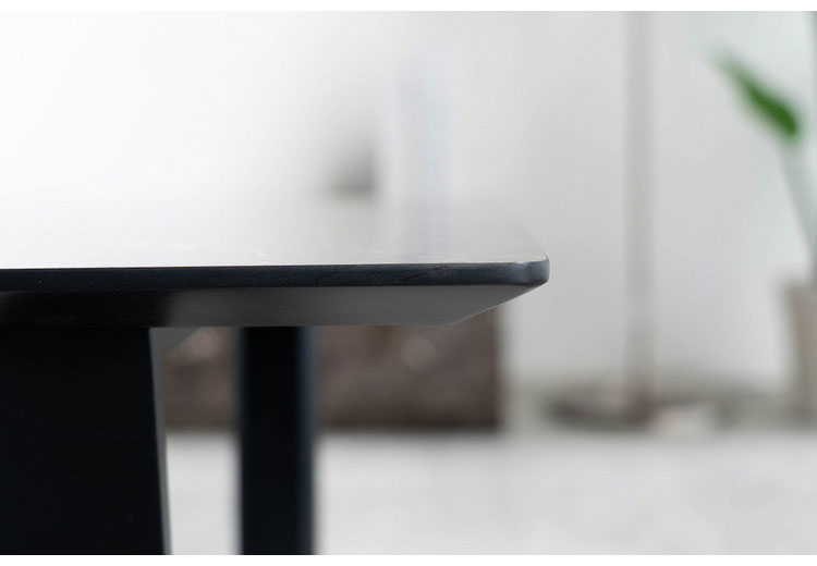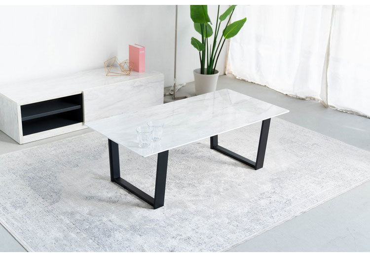 高級感あふれる大理石調の天板と、マットな質感のブラックスチール脚を組み合わせた、モダンでスタイリッシュなリビングテーブルです。天然の大理石では実現が難しい軽量化と、お手入れのしやすさを両立しました。