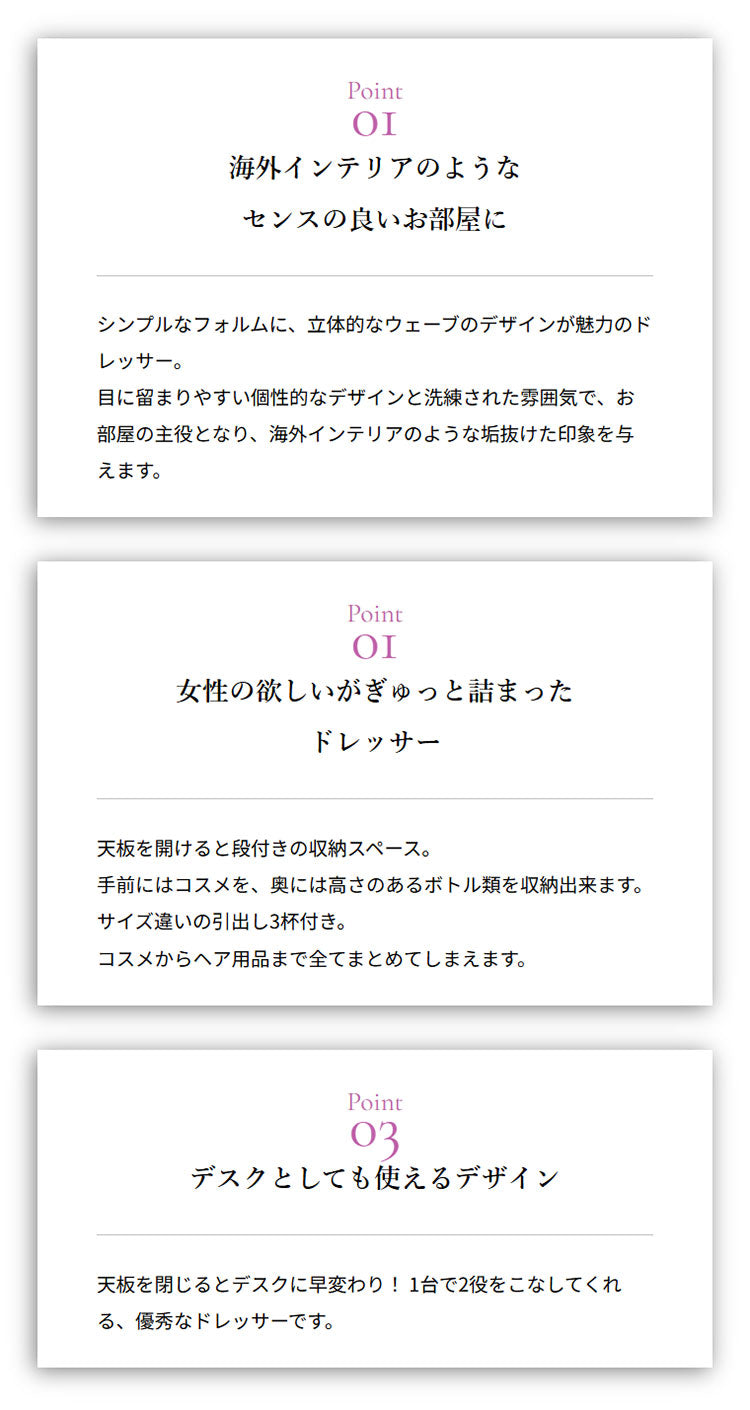 〇シンプルなフォルムに、立体的なウェーブのデザインが魅力のドレッサー。