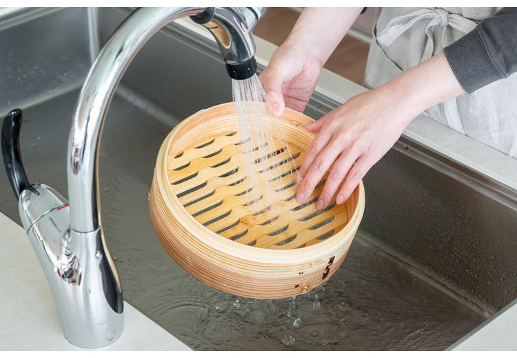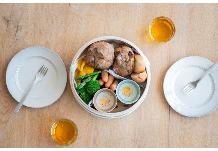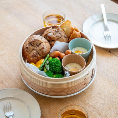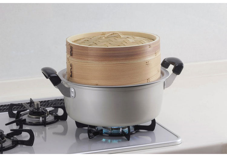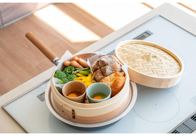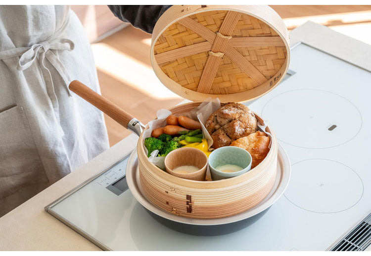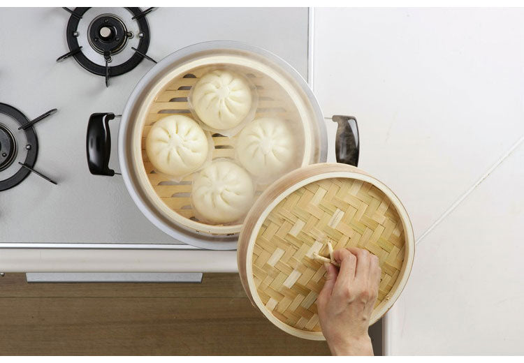 せいろで蒸したシュウマイ、中華まんはふっくらと仕上がり、格別においしさが増します。野菜も茹でるよりも甘味が残り、油で炒めるよりもヘルシーです。ハード系のパンはふっくら焼きたてのような美味しさに。冷凍ごはんの温めにもおすすめです。セイロごと食卓に出せば、見た目にも豪華でおもてなしにもぴったり。業務用としても使われているセイロで、芯材に竹を挟むことで強度を上げていて丈夫です。一般的な中華まん4個が入る大きさです。