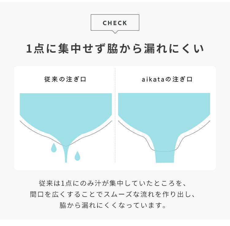 汁がこぼれない秘密は、注ぎ口の特長的な口形状。従来では中心の1点のみに汁が集中していたところを、間口を広くすることでスムーズな流れを作り出しています。