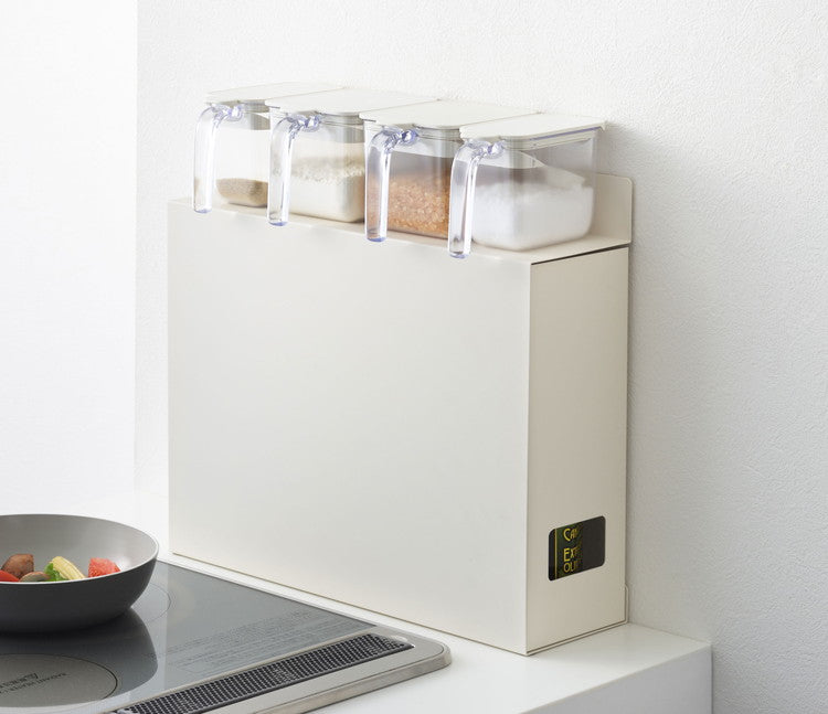 上段は「マーナの調味料ポット」がピッタリ収まります。サッと取り出してスムーズに使えるので、料理がはかどります。