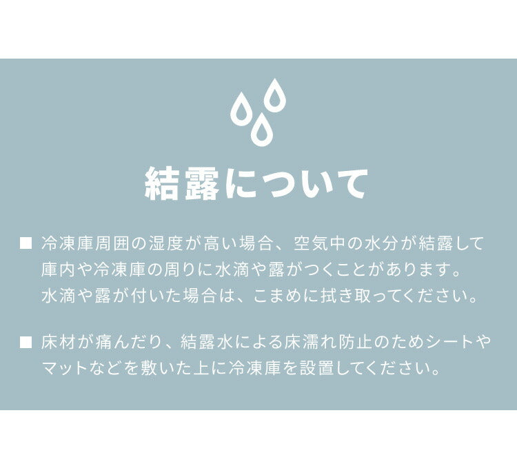 冷凍庫周囲の温度が高い場合、空気中の水分が結露して庫内や冷凍庫の周りに水滴や露がつくことがあります。