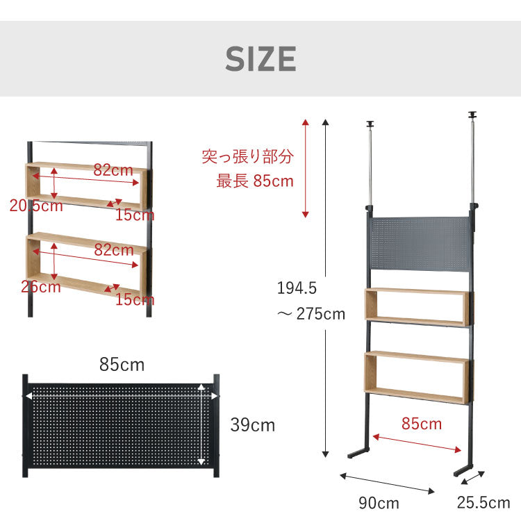 突っ張り 収納ボックス×パンチングラック 90cm 突っ張りラック ペグボード 有孔ボード パンチングボード 壁面収納 ウォールシェルフ オープンラック 突っ張り棚 本棚 間仕切り パーテーション