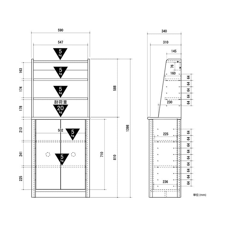 耐荷重:天板20kg、棚板5kg
