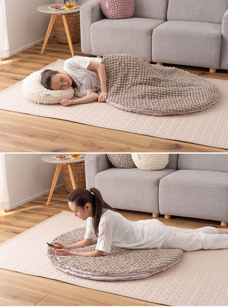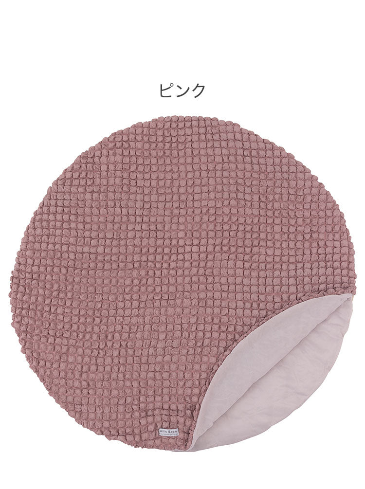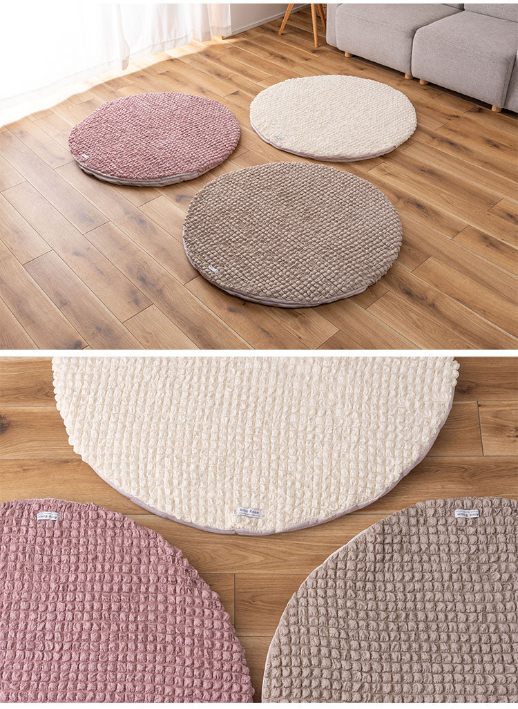 もちもち触感が気持ちいいラウンドクッション、中に入れる形状のフロアクッション、程よいクッション性でお部屋の主役になるラグマットの3アイテムでご用意しています。