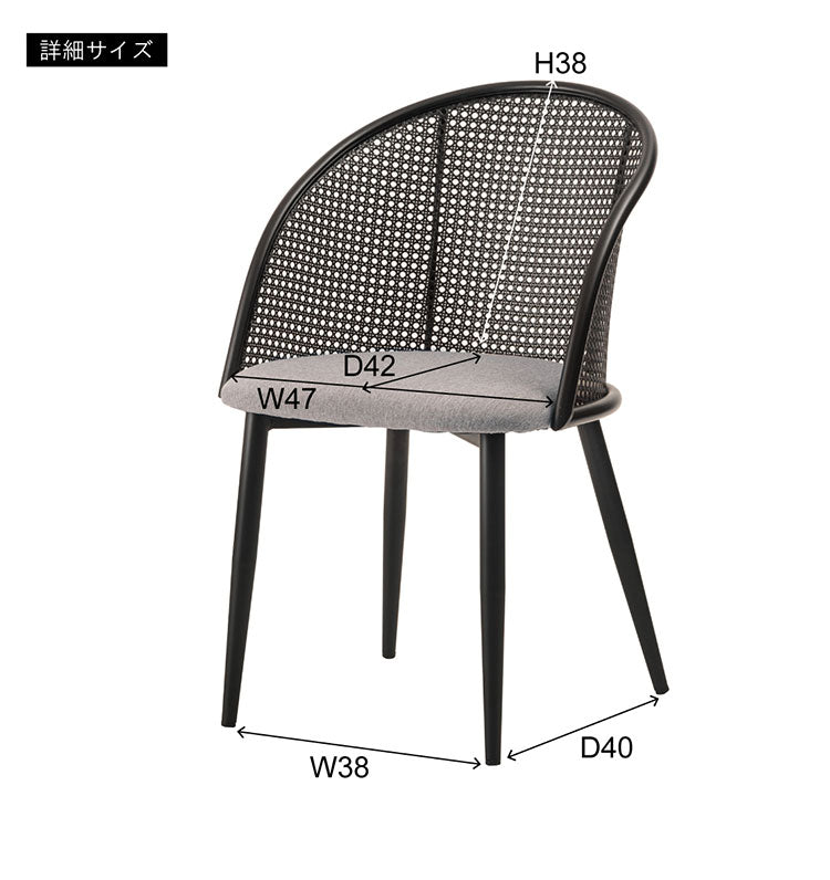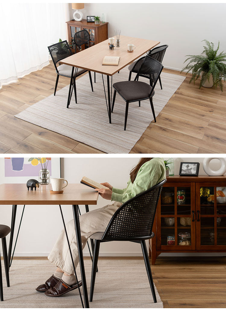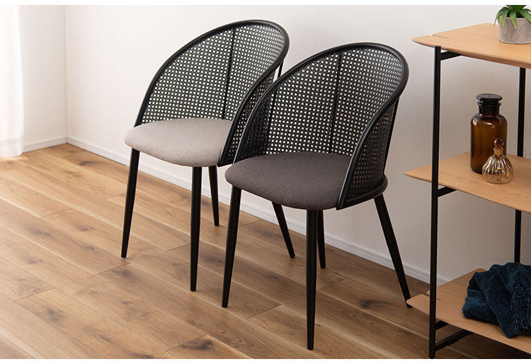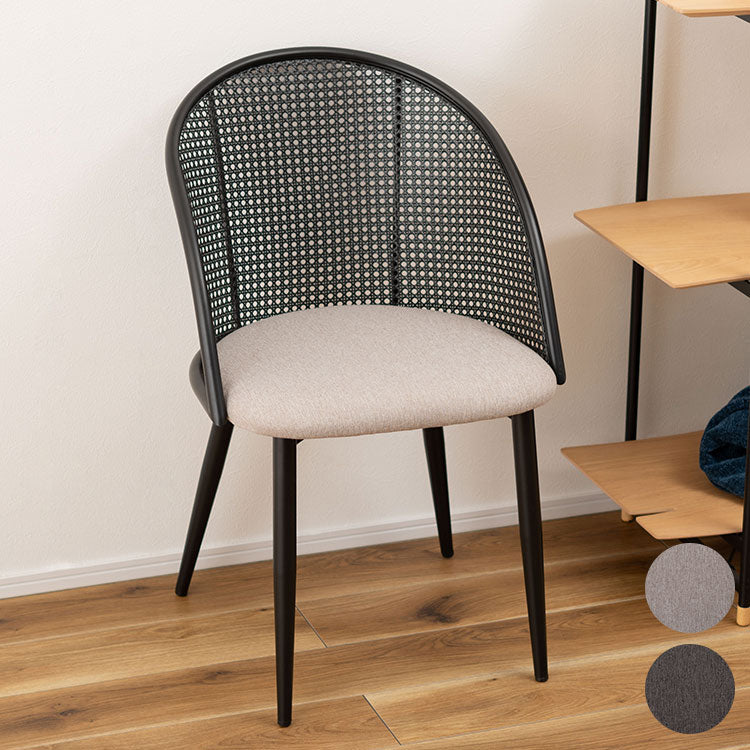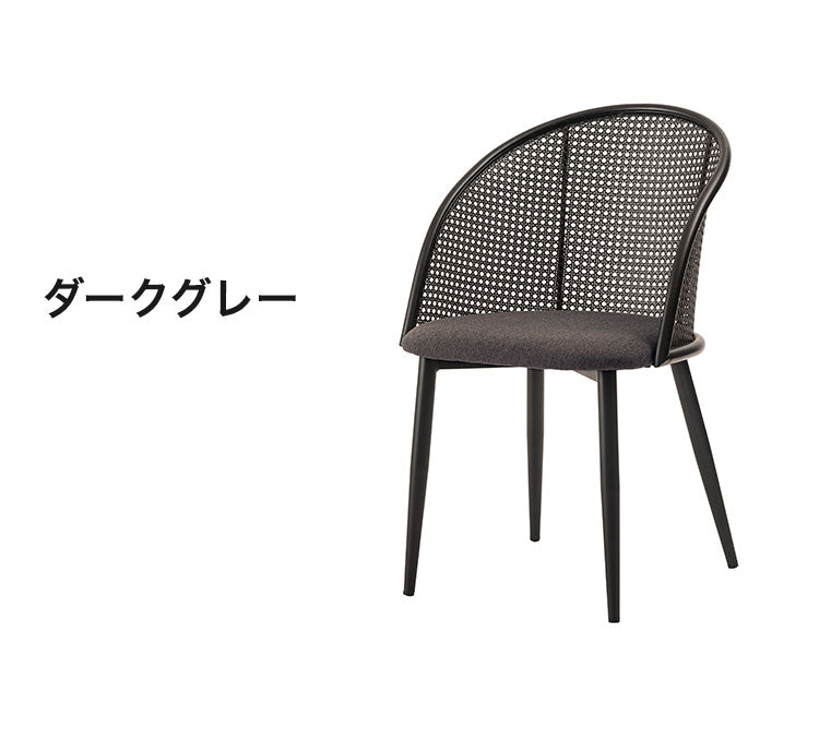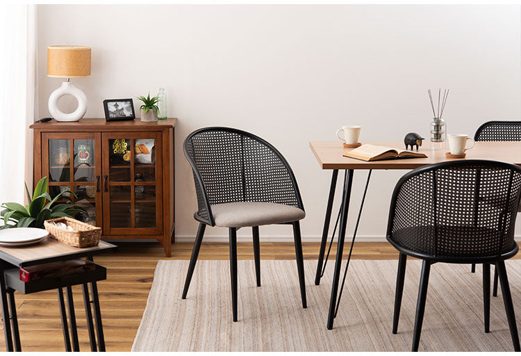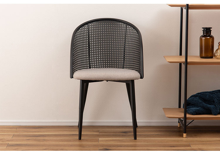 ラタン調×ブラックスチールのスタイリッシュなデザイン シンプルながら目を引くかごめ編み調デザインを施した背面と、艶を抑えたブラックスチールの組み合わせがモダンなチェア。座面には落ち着いた、モノトーンカラーのファブリックを採用。締まった脚部がシャープな印象を与え、空間に上品さを加えます。
