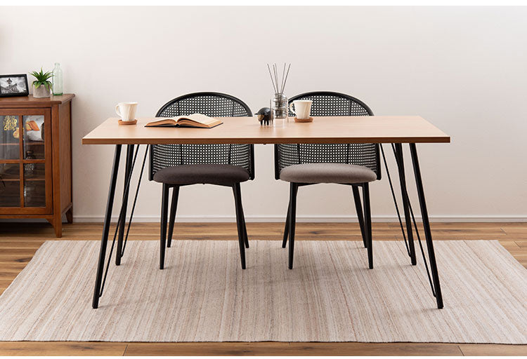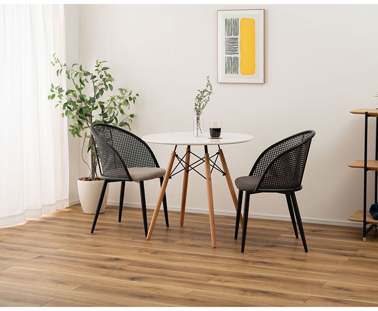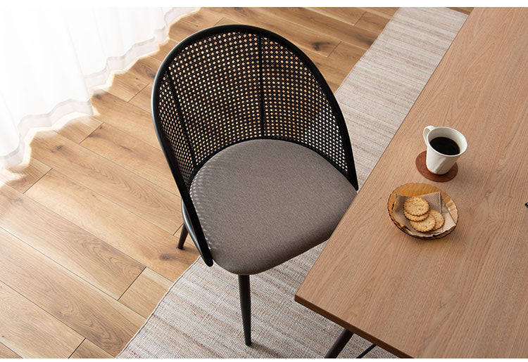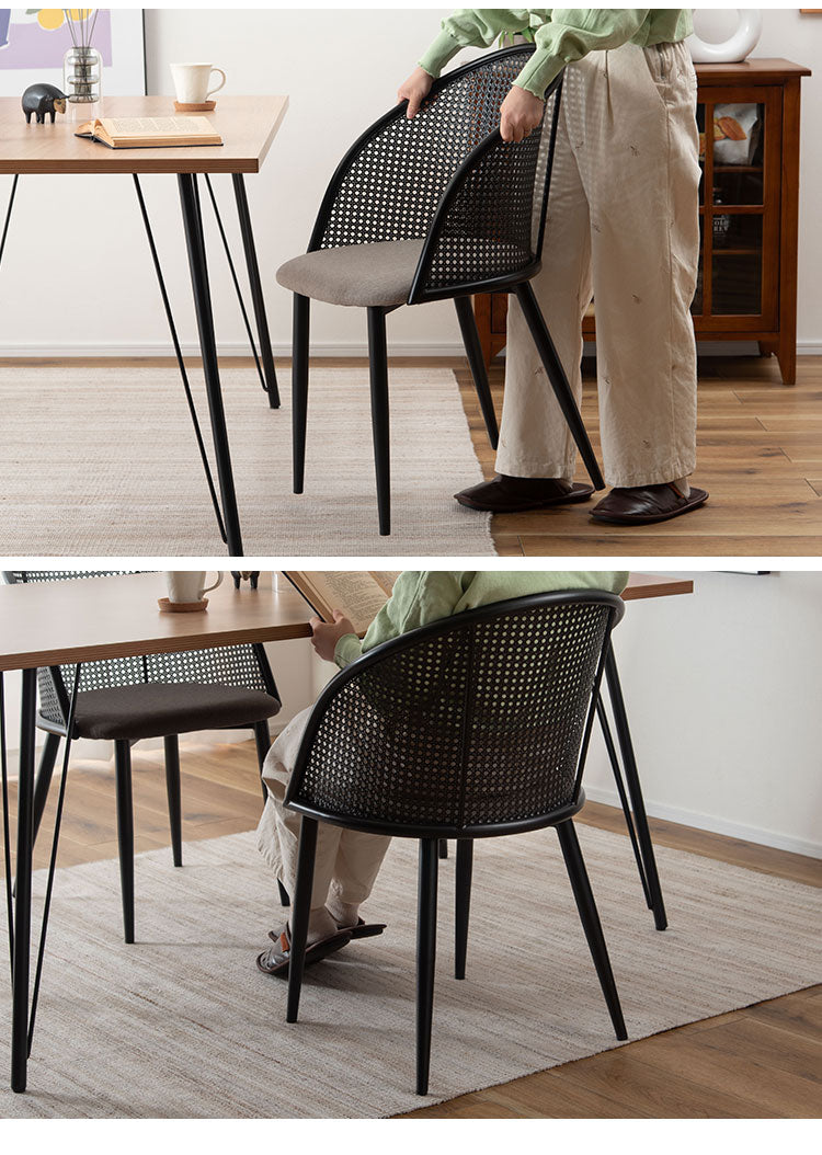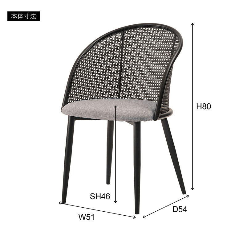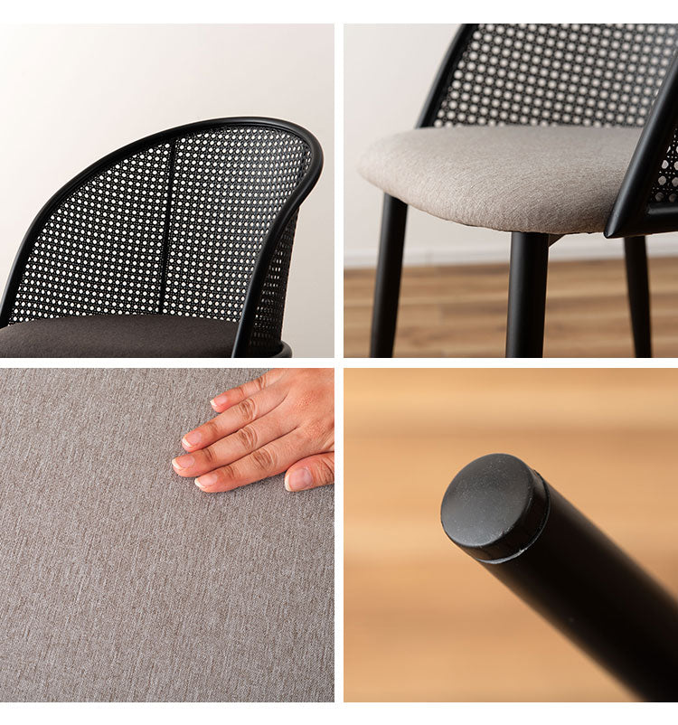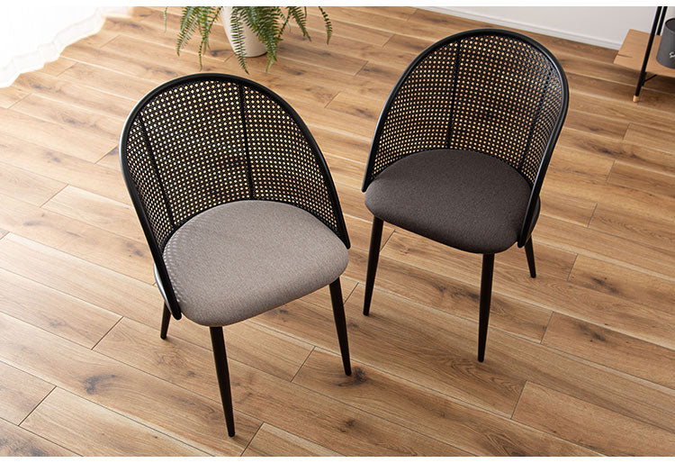 ラタン調×ブラックスチールのスタイリッシュなデザイン シンプルながら目を引くかごめ編み調デザインを施した背面と、艶を抑えたブラックスチールの組み合わせがモダンなチェア。座面には落ち着いた、モノトーンカラーのファブリックを採用。締まった脚部がシャープな印象を与え、空間に上品さを加えます。
