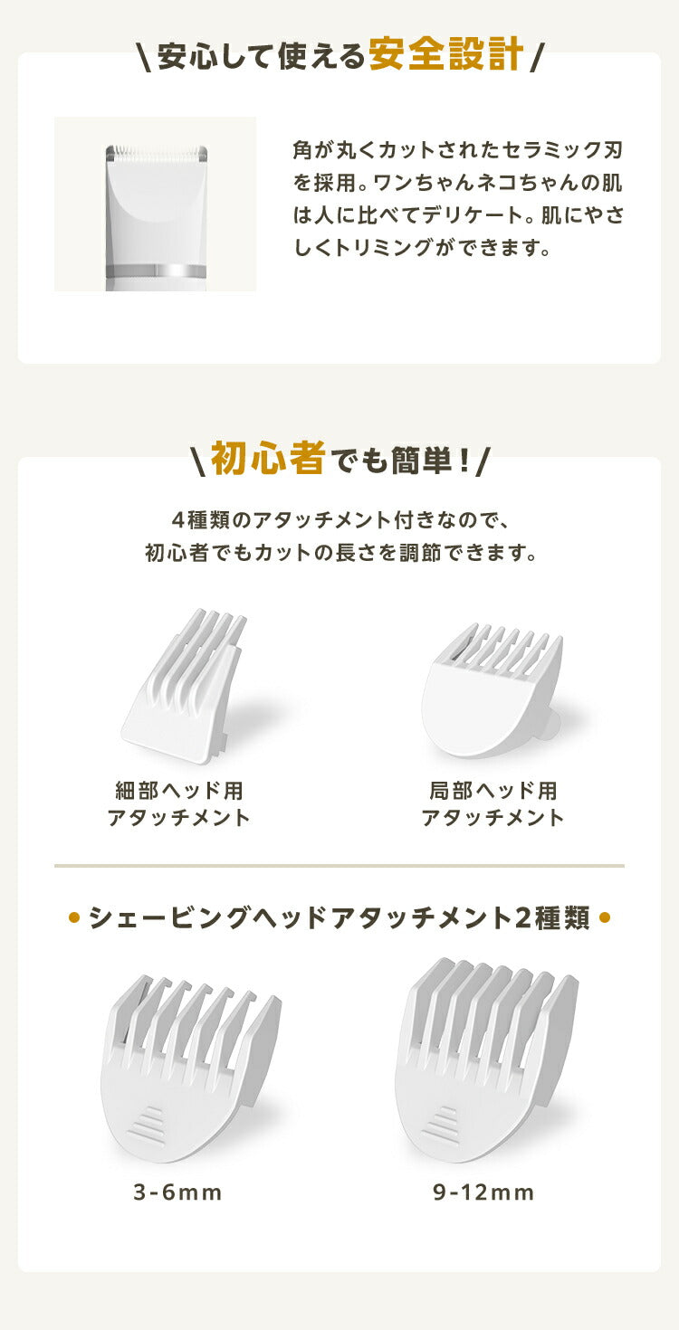 ペット、バリカン、コードレスバリカン、トリミング、全身、部分、爪とぎ、爪みがき、ペット用品、犬用品、猫用品、犬、猫、4in1、静音、USB充電、お手入れ簡単、水洗い可能、軽量、使いやすい、持ちやすい、初心者、ペットトリマー、全身カット、部分カット、長さ調整、アタッチメント