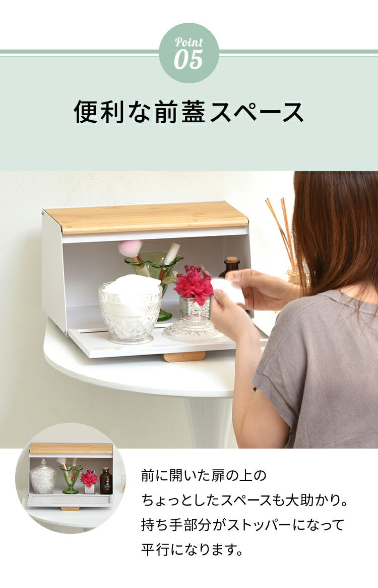 前面の扉と天板が開くので出し入れしやすく、生活感のあふれる雑貨をまとめて収納できます。