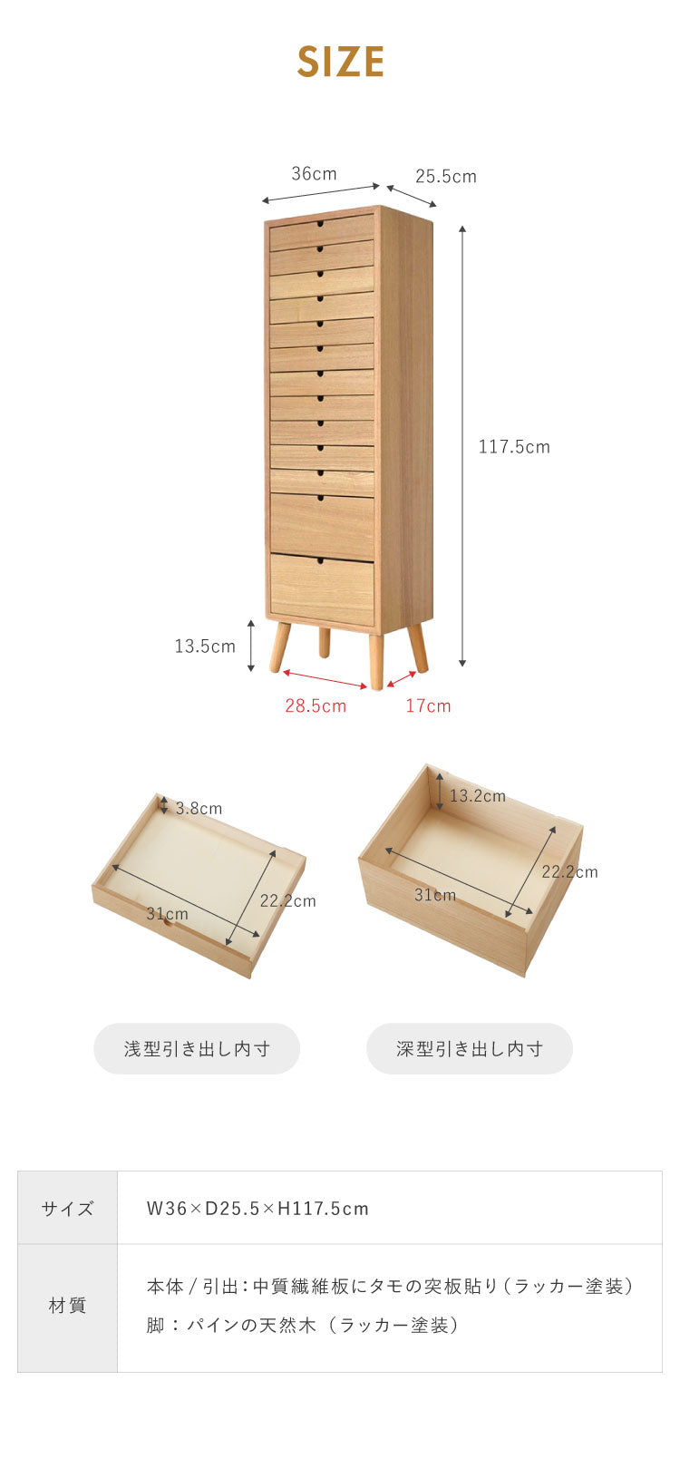 【本体/引出】中質繊維板にタモの突板貼り(ラッカー塗装)