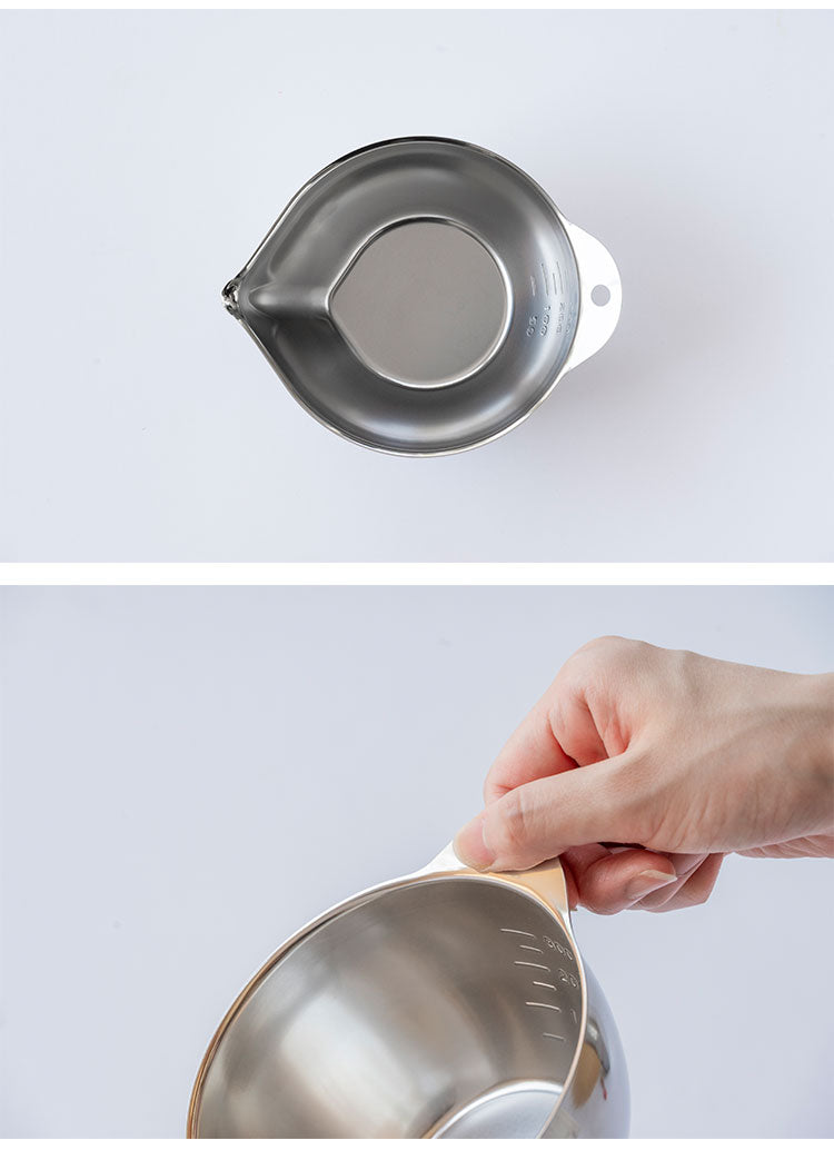 2段階に折り曲げた注ぎ口が、液体の流れをピタッと止めて、キレよく注げます。