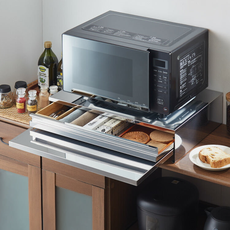 家電下、スライドテーブル、スライドトレー、ステンレス、日本製、燕三条、国産、キッチン収納、レンジラック、レンジ台、作業台、作業トレー、電子レンジ、炊飯器、オーブンレンジ、カウンター上
