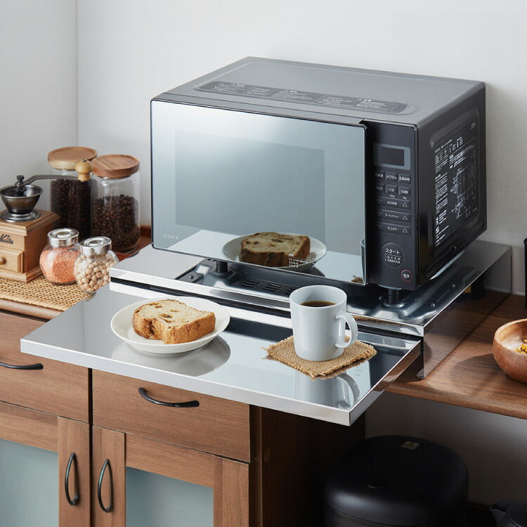 家電下、スライドテーブル、スライドトレー、ステンレス、日本製、燕三条、国産、キッチン収納、レンジラック、レンジ台、作業台、作業トレー、電子レンジ、炊飯器、オーブンレンジ、カウンター上