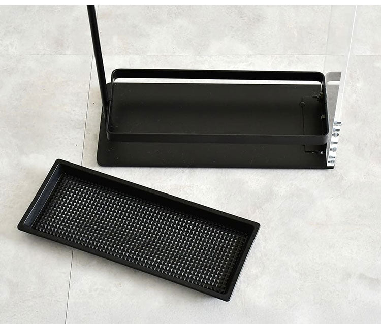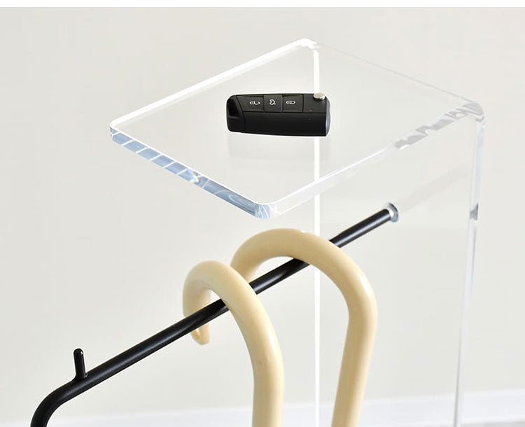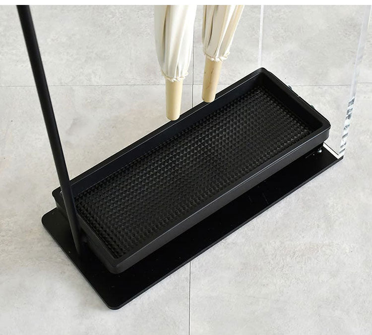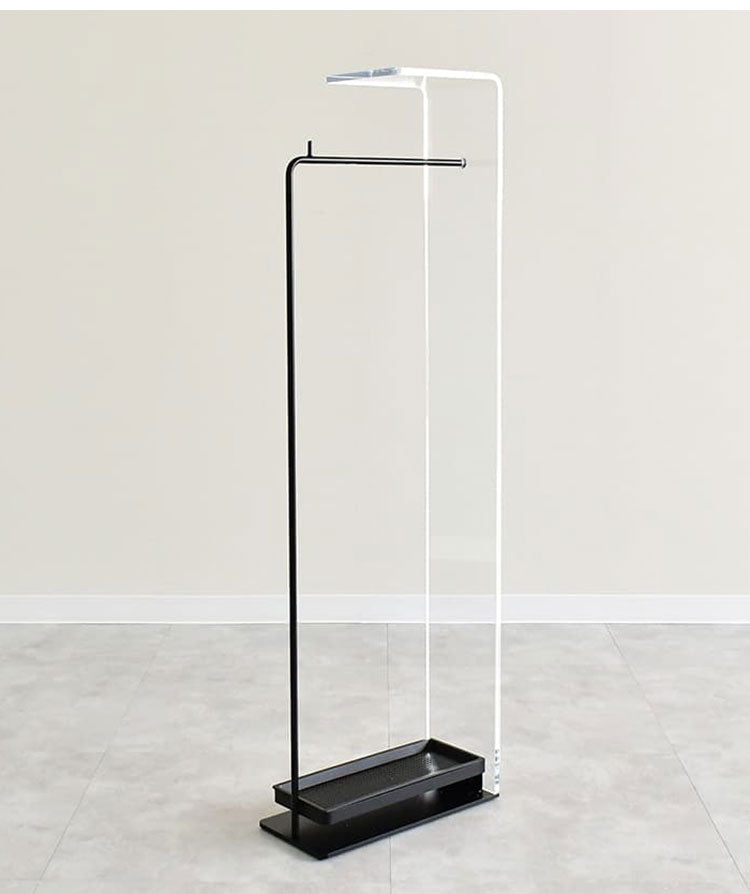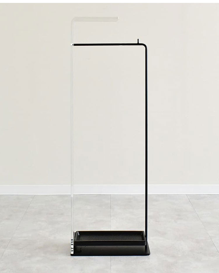 10mm厚のアクリルを贅沢に使用し、国内ならではの美しい曲げ加工が映えるアンブレラハンガー。 浮遊感のあるフォルムが玄関を上質に演出しながらも、天面には鍵やスマホのちょい置きもでき機能性も装備。 長傘は4~6本、フック付きだから折り畳み傘も収納可能。 取り外せる雨受け皿付きで、お手入れも簡単。 エントランス空間に溶け込みながらも、存在感と美しさを備えたデザインです。