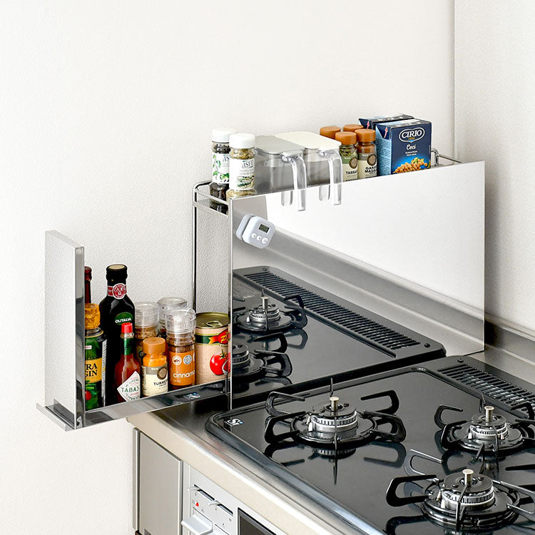 日本製、燕三条製、国産、ステンレス製、調味料ラック、スパイスラック、引き出し、引出し、収納、ドロワー、マーナ、調味料ポット、コンロ横ラック、コンロサイドラック、油跳ねカバー、油跳ねガード、油はねカバー、油跳ねガード
