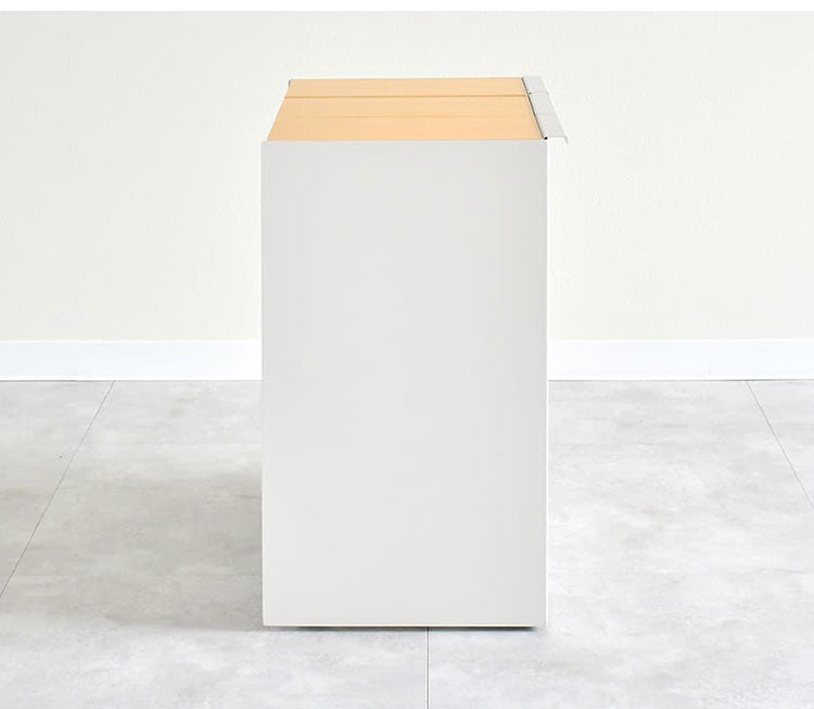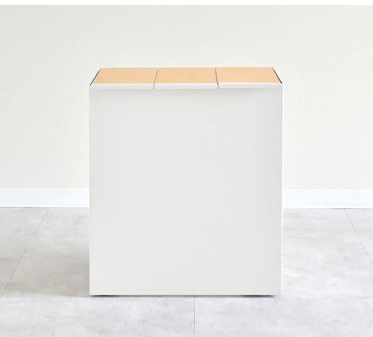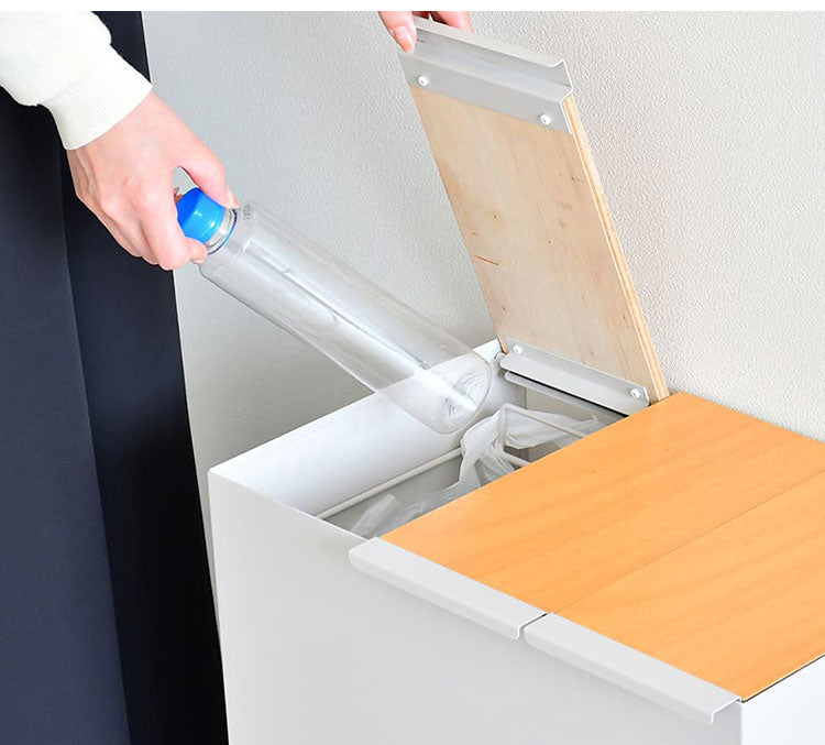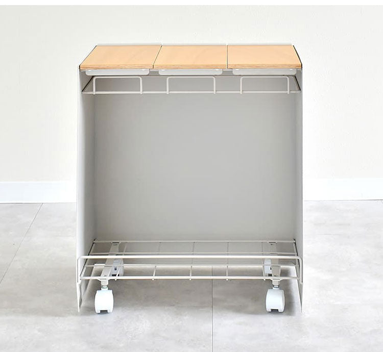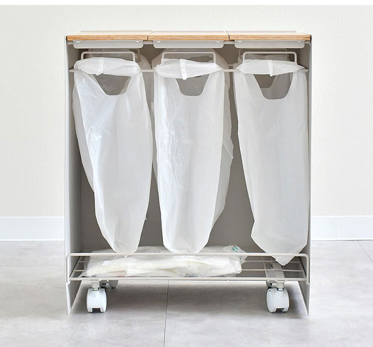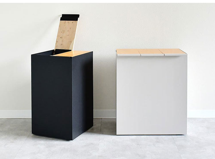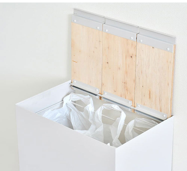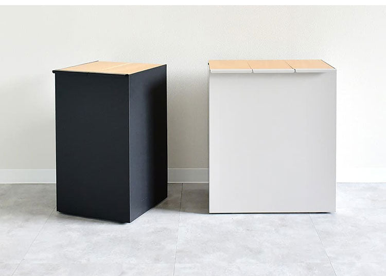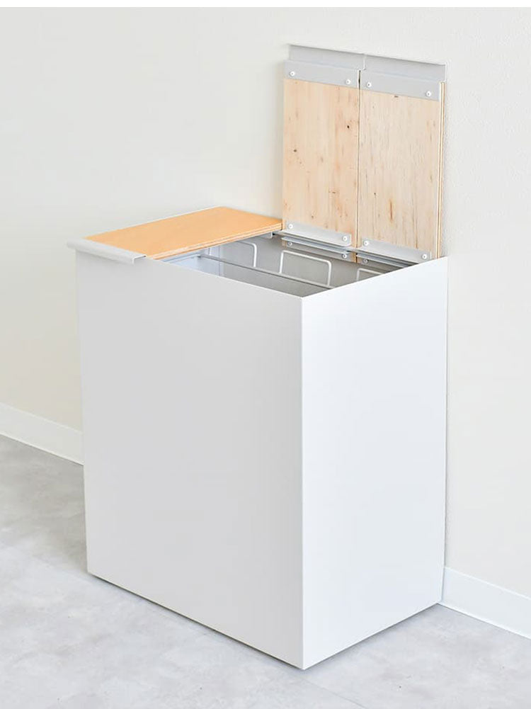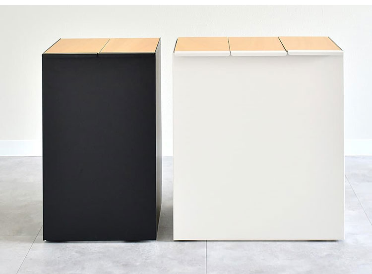 手提げ袋を引っ掛けるだけの手軽さはそのままに、前面・上部を隠して生活感をカバー。 隠しキャスター付きで、掃除や移動もスムーズに。 2分別と3分別タイプがあり、それぞれ個別に開閉できる木板デザインが魅力です。 背面はオープン設計で、袋の設置や回収がしやすく実用性も抜群。 空間になじみ、キッチンやリビングにも自然に溶け込みます。