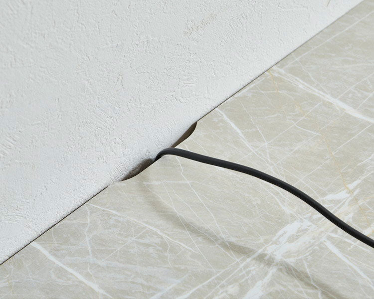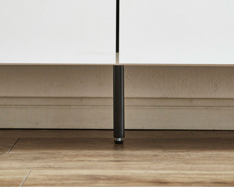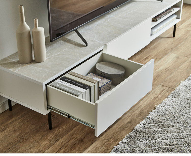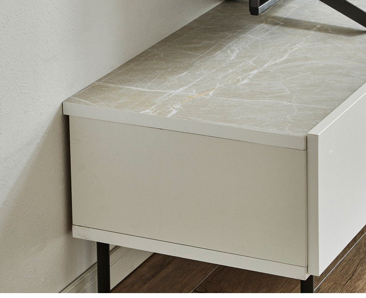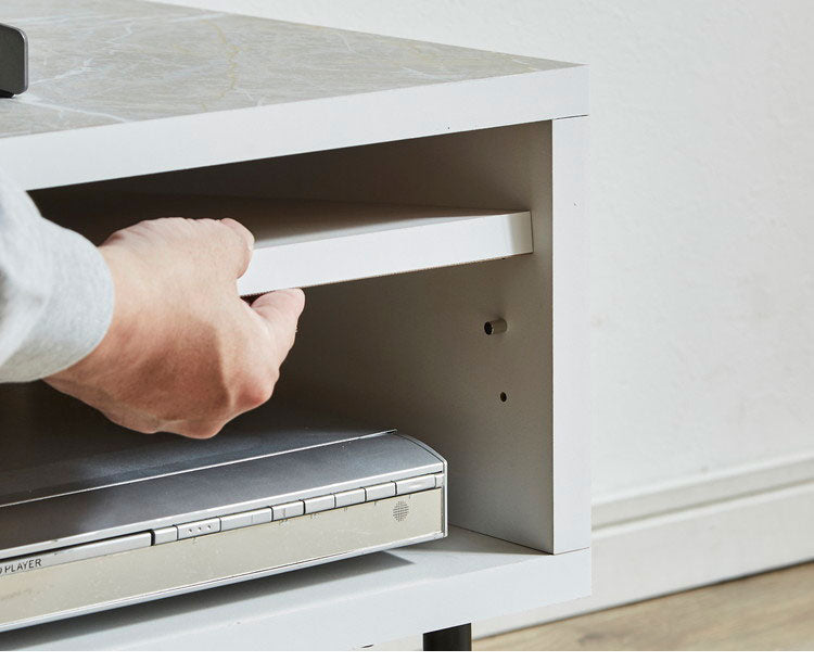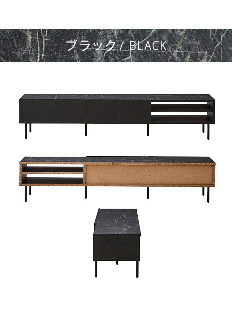 シックなデザインの180cm幅テレビボードです。大容量の収納力でオープンスペースは可動棚を採用しているので、用途に応じて自由にレイアウトできます。空間を演出するシックなデザインとして石目調のブラックとホワイトを採用。品のあるデザインとなっております。天板の後方にはテレビの配線などを逃がすためのスリットを奥行1cm、幅10cm分を空けていてテレビ台を壁にぴったりくっつけても配線を通すことが出来ます。引き出しはシンプルさを追求したハンドレスの設計。手が触れる部分は丸みのあるロー官という素材を使用しており、服をひっかける心配もありません。収納の有効内寸の高さが15cmあるので分厚めの書物なども収納できます。また引き出しにはフルオープンのスライドレールを採用しているので、最後まで引き出して使用することが可能です。可動棚板は1枚入りで3cmピッチで3穴ついています。
