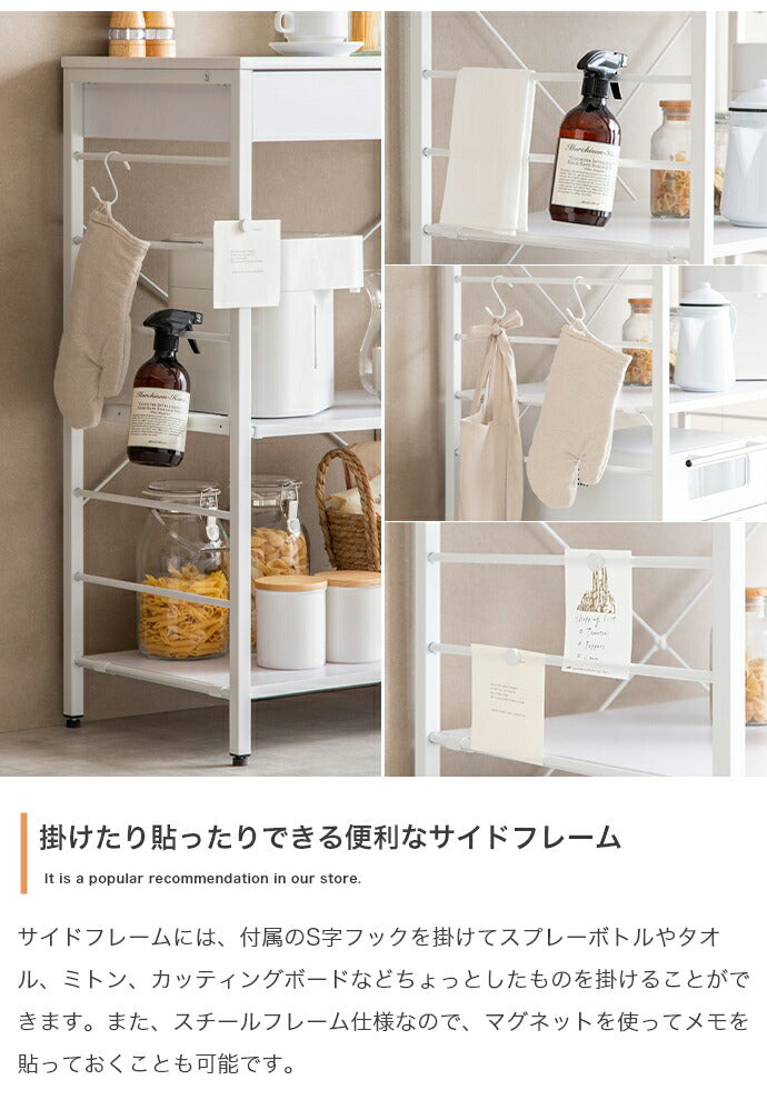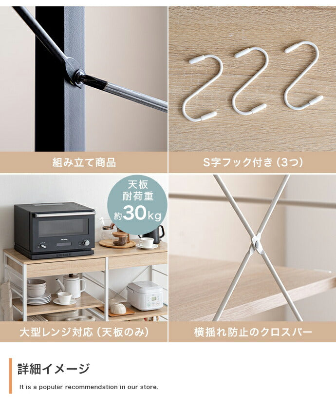 たっぷり大容量収納を叶えるレンジラック。幅120cmと豊富な収納力を備えており、キッチンに不可欠な家電や雑貨・食器等をまとめて1台に収納していただけます。また、シンプルなフレームデザインは視界を遮らず、圧迫感を与えないため、お部屋をすっきり見せたい方にもおすすめです。