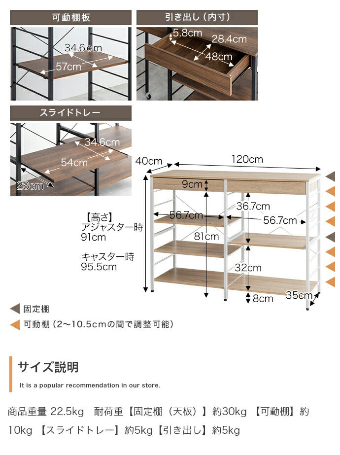 サイズ幅120cm×奥行40cm×高さ(キャスター装着時):95.5cm (アジャスター装着時):91cm
