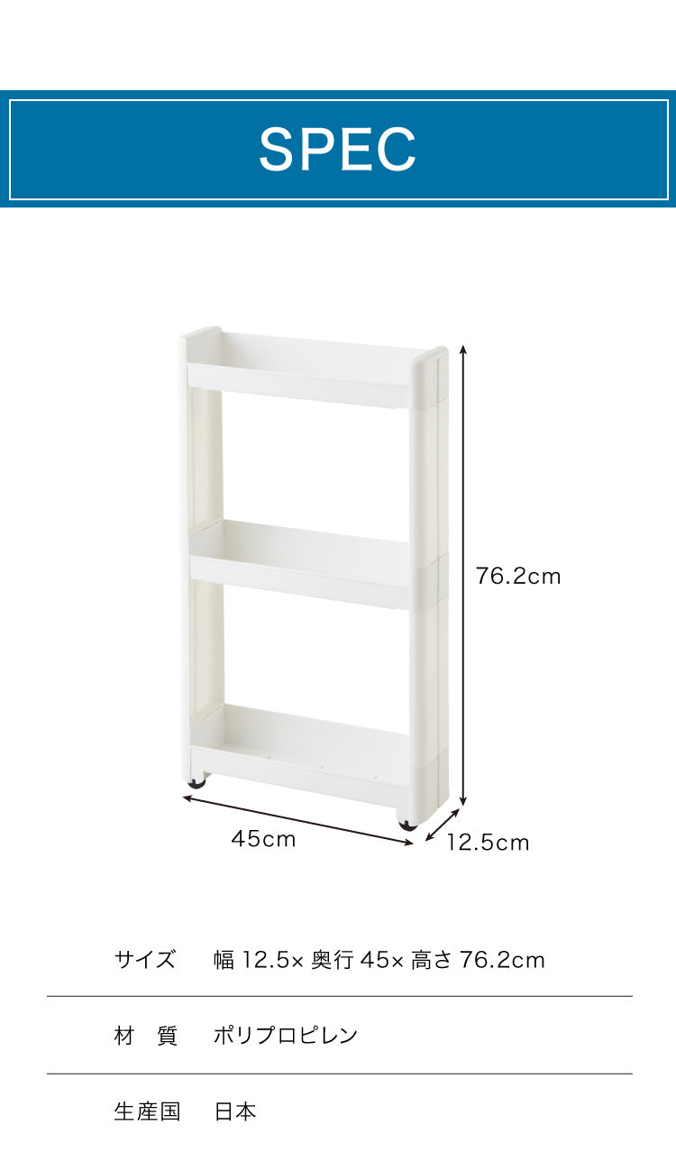 幅わずか12.5cmで冷蔵庫・食器棚・洗濯機横などのすき間に収納ができます。