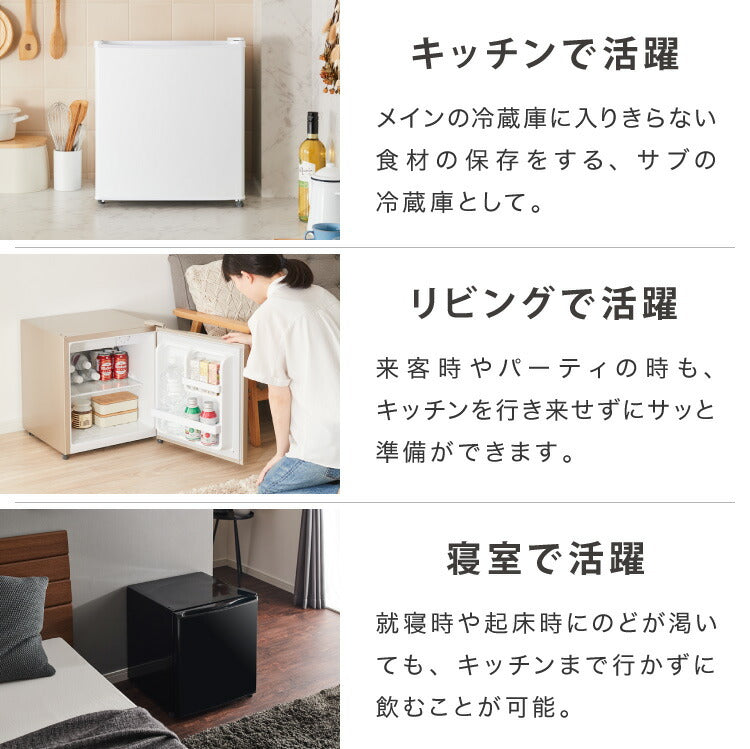 ホワイト、ブラック、ゴールド、冷蔵庫、1ドア、1ドア冷蔵庫、一人暮らし、省スペース冷蔵庫、ミニ冷蔵庫、省エネ冷蔵庫、1ドアフリーザー、自動霜取り、霜取り、食材、保管、シンプルデザイン、省スペース、コンパクト、ホテル、寝室、新生活、セカンド、サブ冷蔵庫、小型冷蔵庫、シンプル