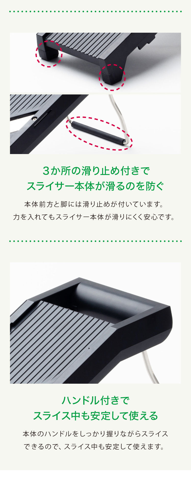 本体前方と脚には滑り止め付き。3か所の滑り止めでスライサー本体が滑るのを防ぎます。