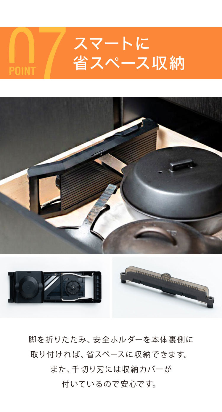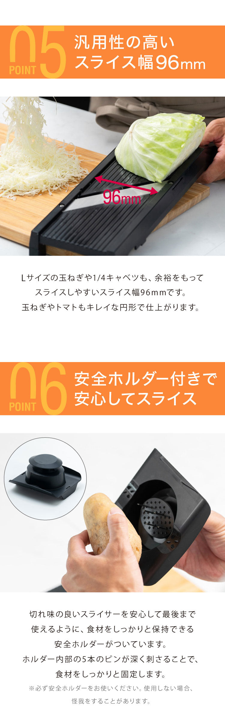 切れ味の良いスライサーを最後まで使えるように、食材をしっかりと保持できるホルダーがついています。