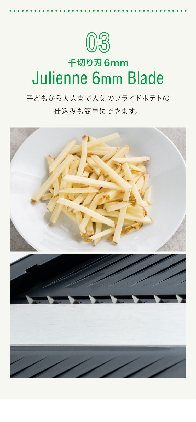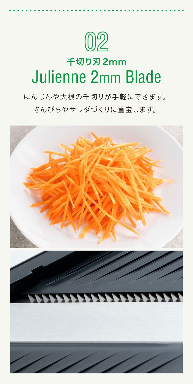 千切り刃 2mmは、人参や大根などの千切りが手軽にできます。サラダづくりに重宝します。