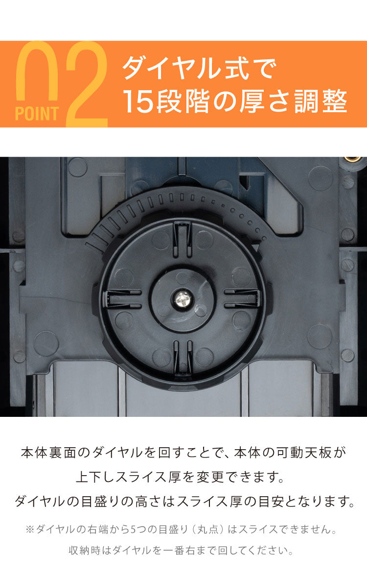 ダイヤルの右端から5つの目盛り(丸点)はスライスできません。収納時はダイヤルを一番右まで回してください。