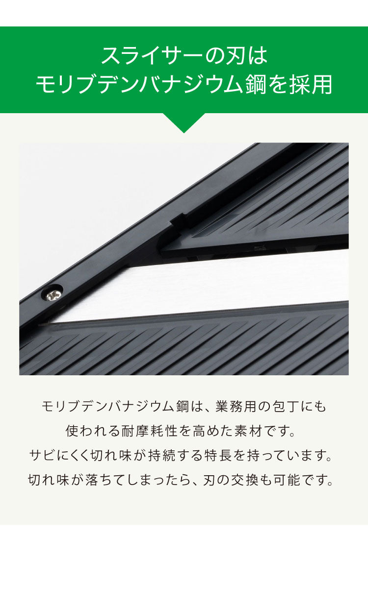 包丁づくりの技術を取り入れているため切れ味抜群。食材を最後まで均一な厚さで食材をカットできます。