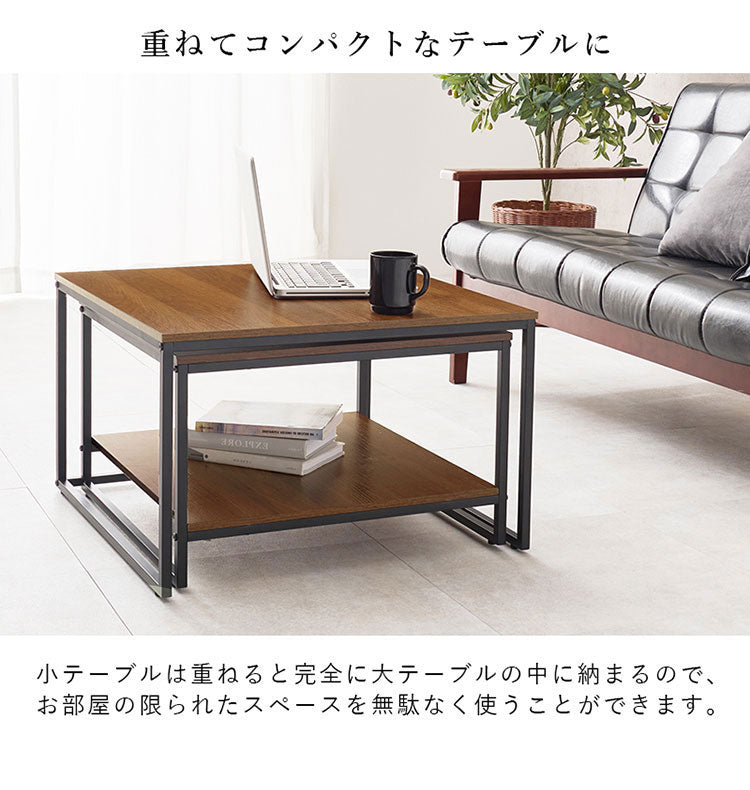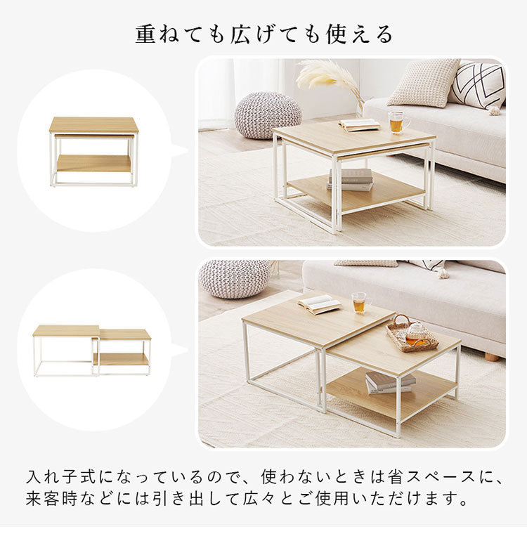 重ねたり、広げたり、別々に置いたりとレイアウトの自由度が高いネストテーブル。小テーブルは棚付きで読みかけの本などを置く収納スペースとしても使えます。