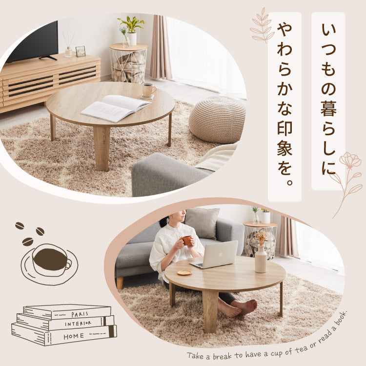 PC作業などにも余裕のある円形ローテーブル。来客時の食事にもちょうど良いサイズです。