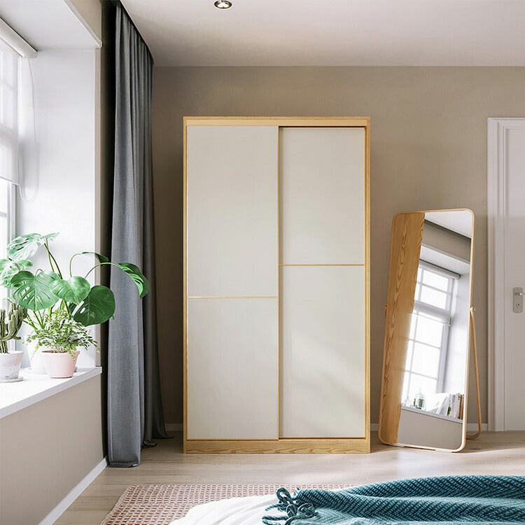 この120cmスライド扉クローゼットは、ナチュラル&ホワイトの色合いが魅力のパーティクルボード製クローゼットです。高品質なアルミニウム合金と金属製のハンガーレールを使用し、耐久性と使いやすさを兼ね備えています。幅広のスライド棚で収納も抜群なので、スペースを有効活用できます。