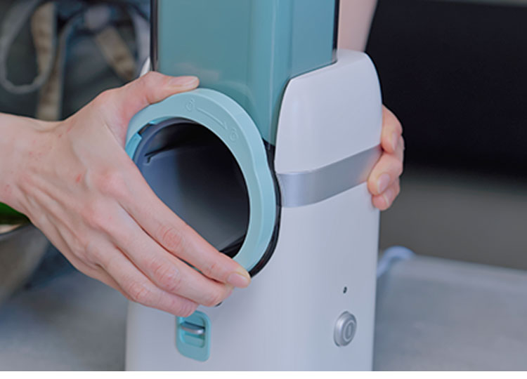 ジャガイモ1つが丸ごと入る大口径の入り口から食材を投入して、スイッチを押して蓋をすると刃が回転して食材をらくらくカット。