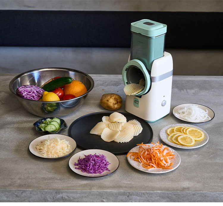 5種類の刃で輪切り・みじん切り・千切り(長・短)はもちろん波線の入った輪切りまでできちゃいます。