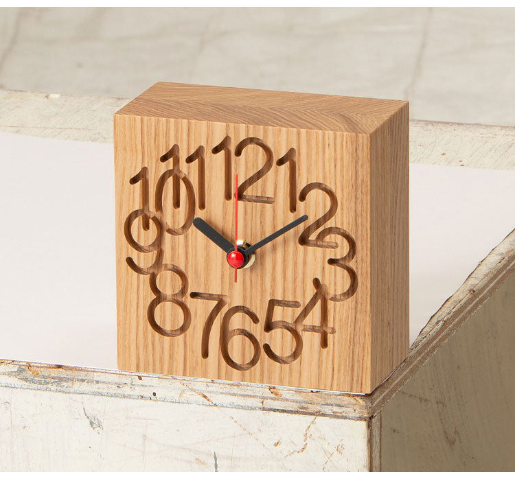 接ぎ合わせて厚みをもたせた無垢材に数字を彫り込んだ、木質感たっぷりのユニークな時計。