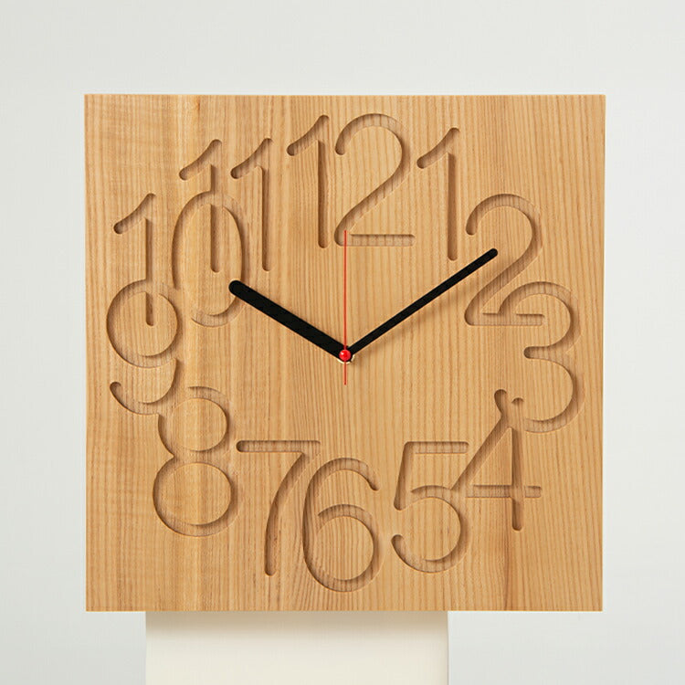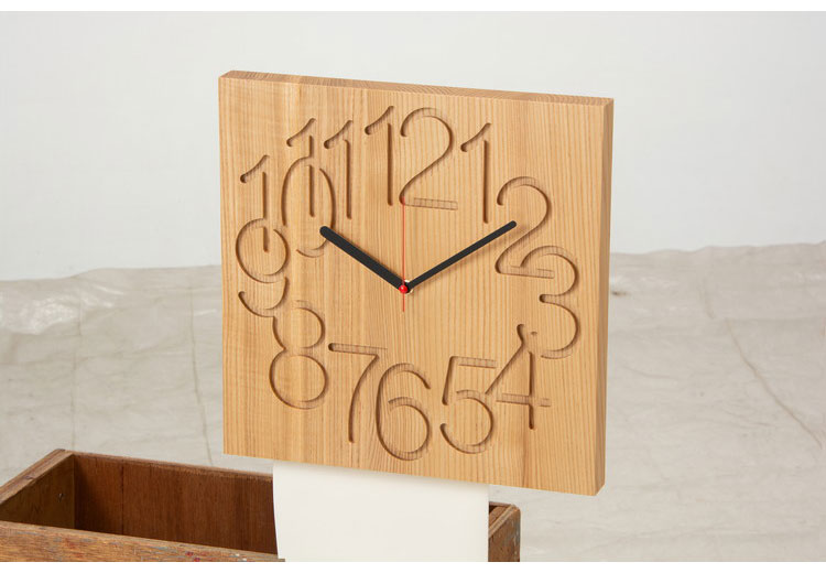 厚い無垢材に数字を彫り込んだ、木質感たっぷりのユニークな時計。