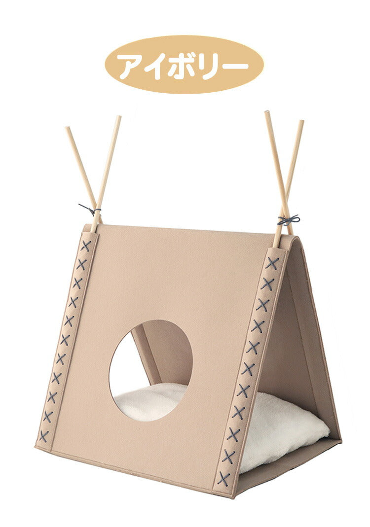 柔らかいフェルト生地仕上げ。天然木のポールがアクセント、さんかく屋根にφ20cmの遊び穴、入り口も付いています。天井が高く広々空間。350×450mmボアクッション付。