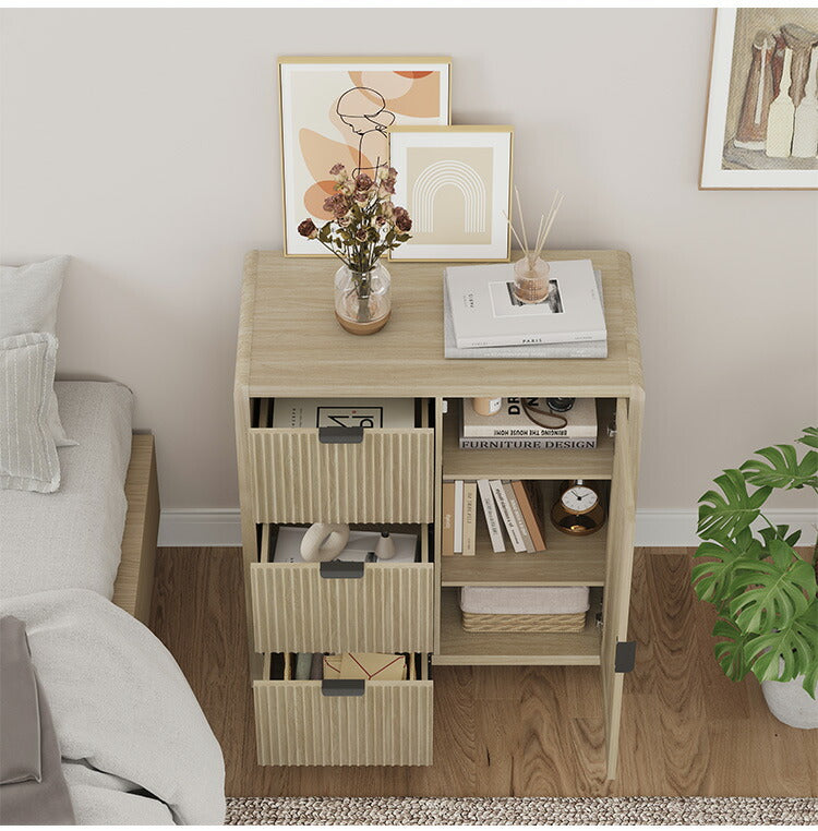 リビングに置いてサイドボードとして利用したり、キッチンに置いてトースターやケトルなどを置く台やベッド脇の収納など、様々なシーンで活躍します。