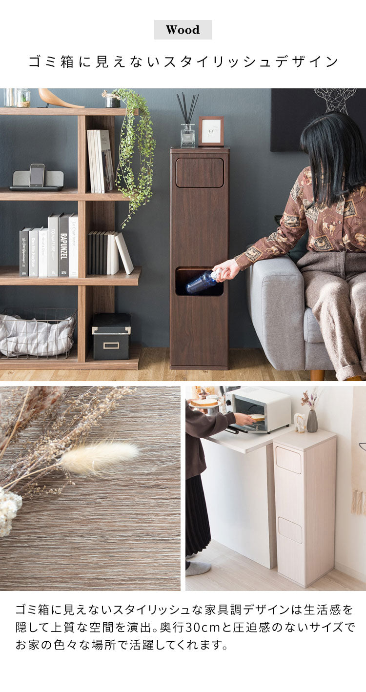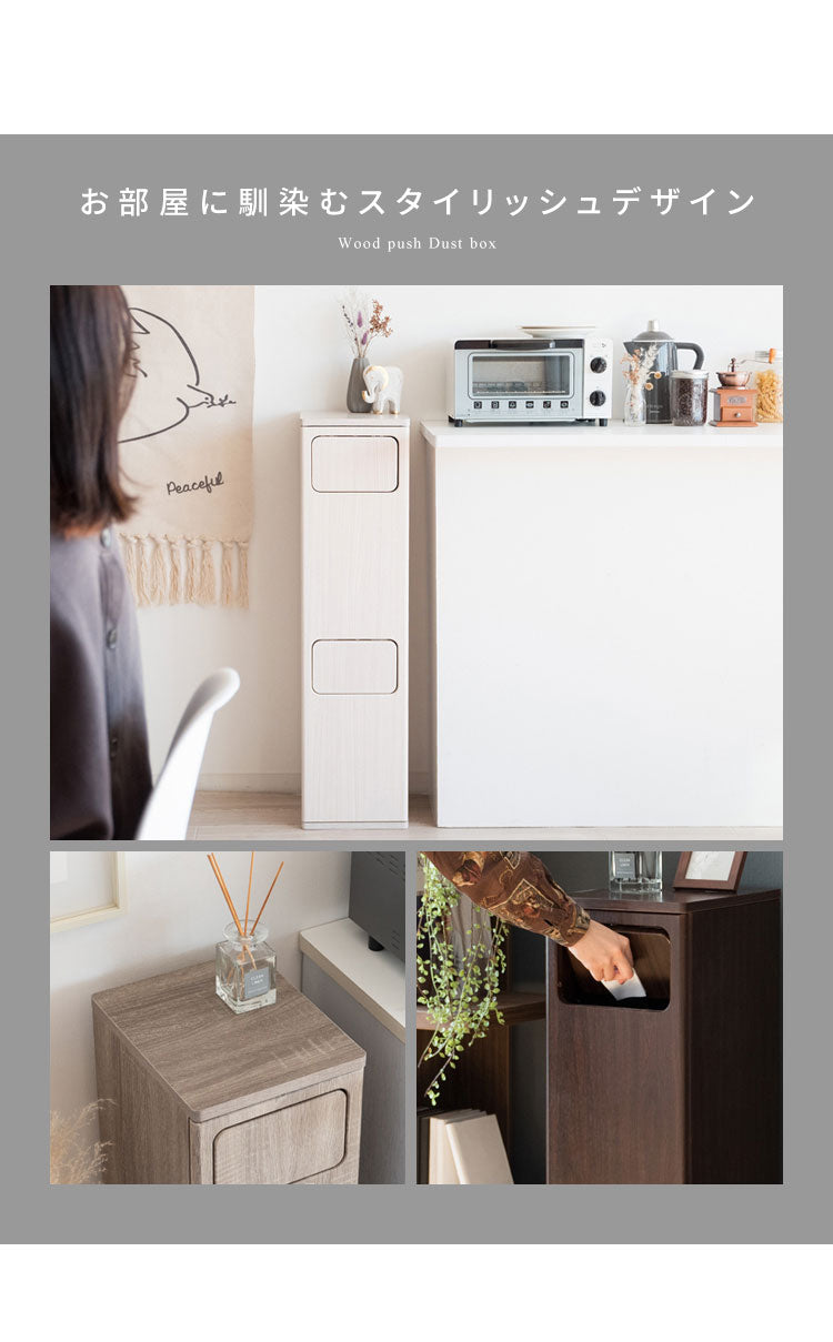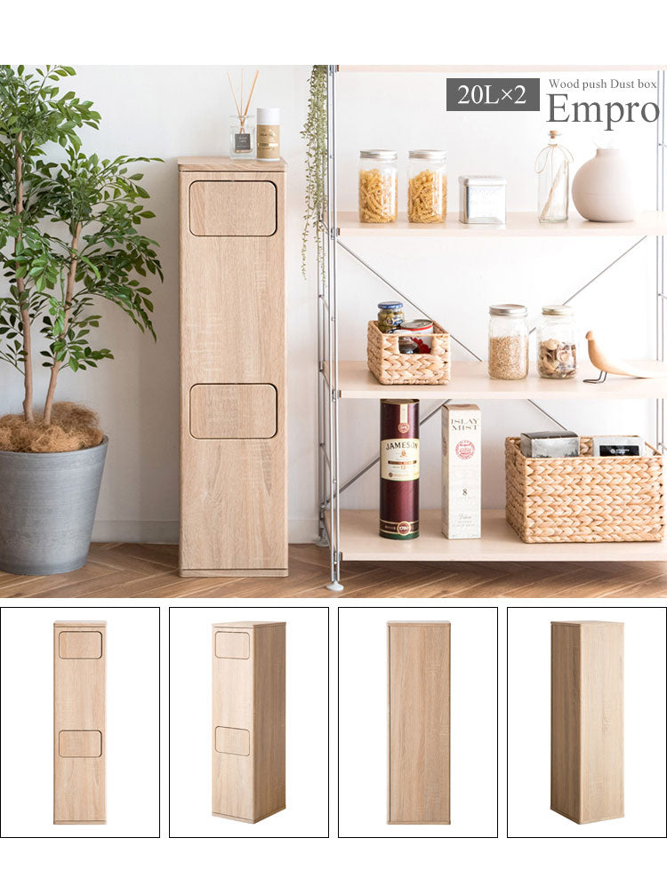 ゴミ箱に見えないスタイリッシュなデザインでお部屋に馴染む、木製プッシュ式ダストボックス「Empro(エンプロー)」の二段タイプ。スリムで場所を取らないので家具や家電のすき間に置けます。