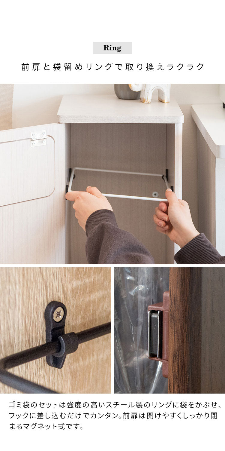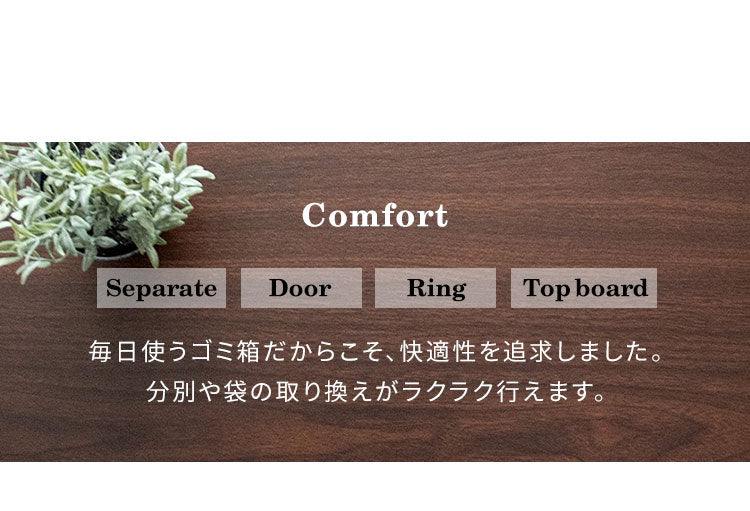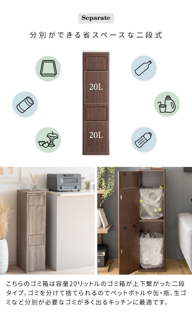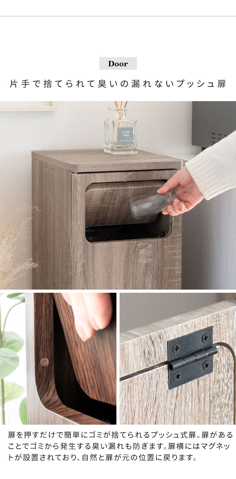 それぞれ容量20Lでキッチンやリビングや寝室など色々なゴミが出る場所でも簡単に分別できます。ニオイが漏れにくく押すだけで簡単に捨てられるプッシュ扉式。ゴミ袋の着脱も簡単な前扉があり、利便性もバツグンです。