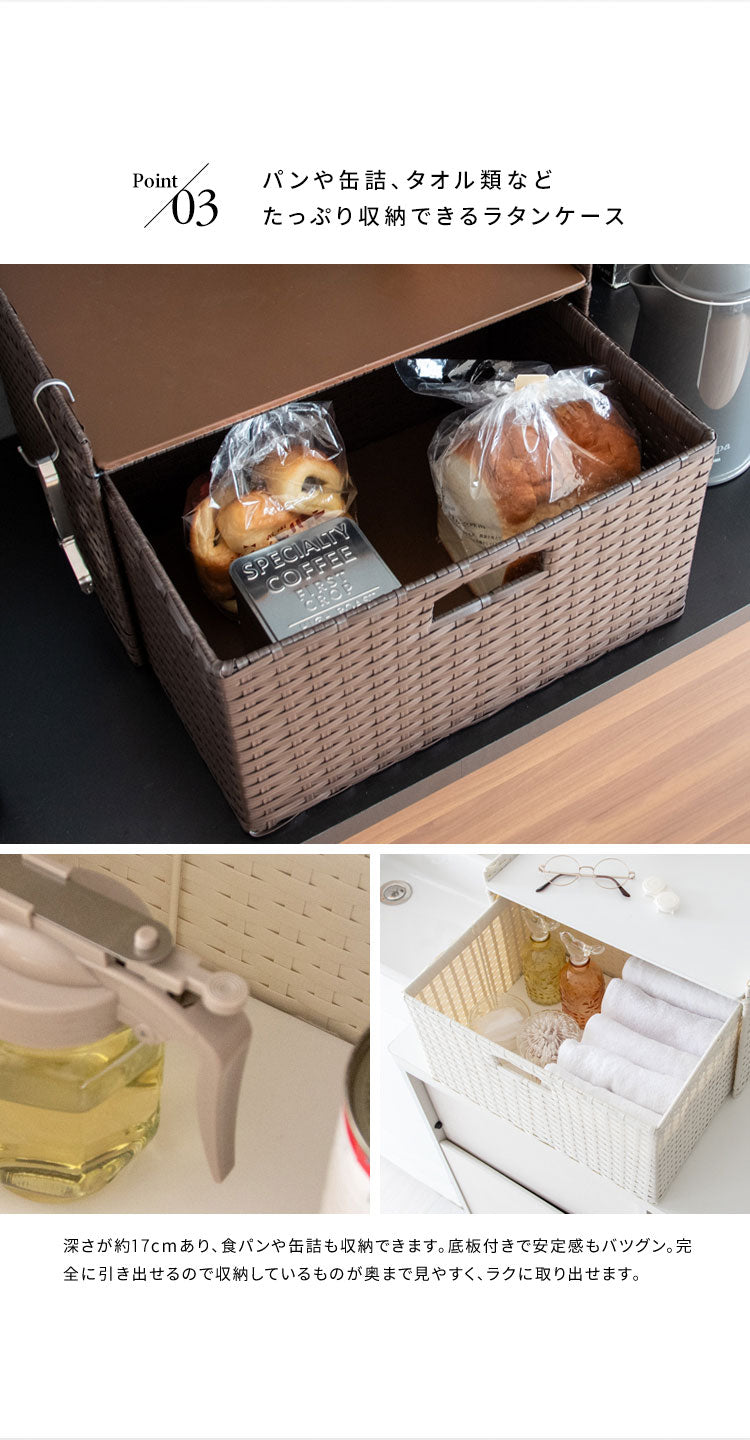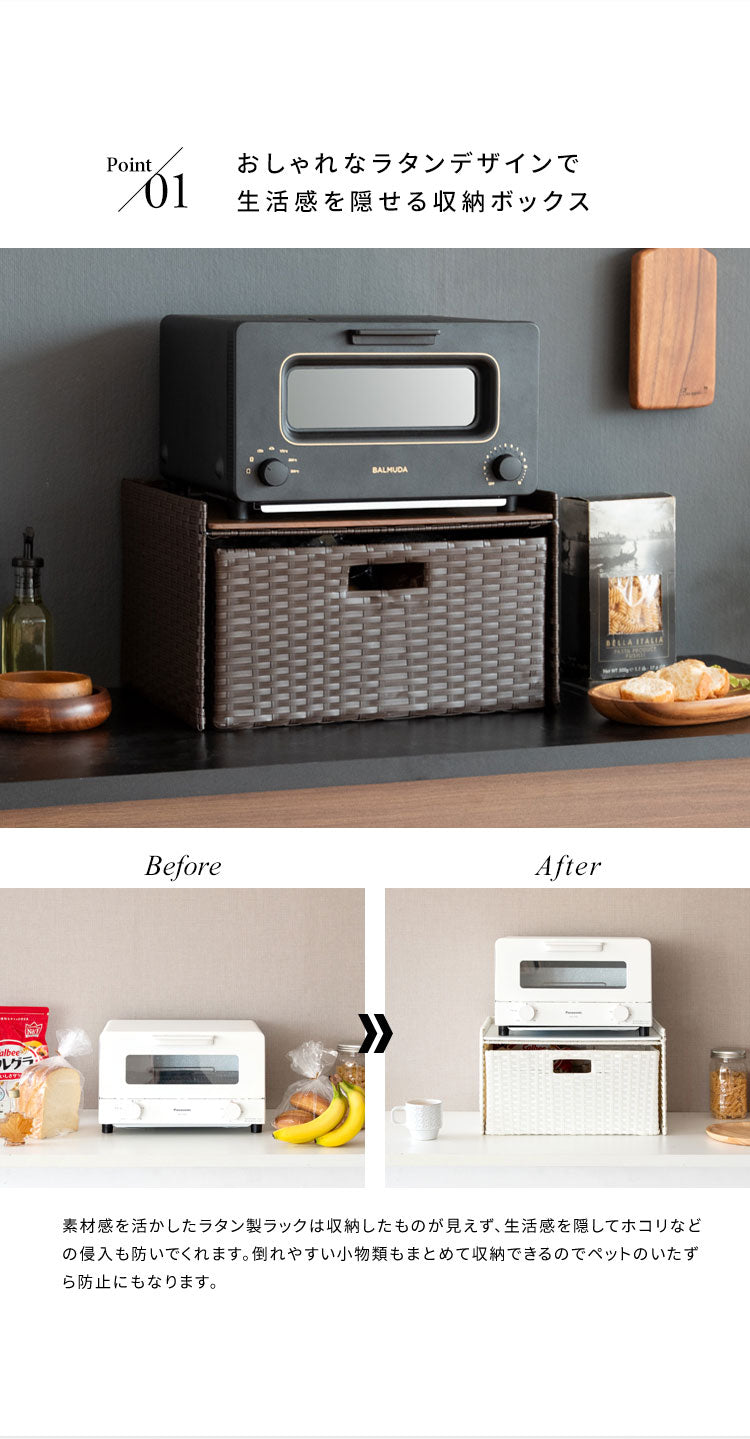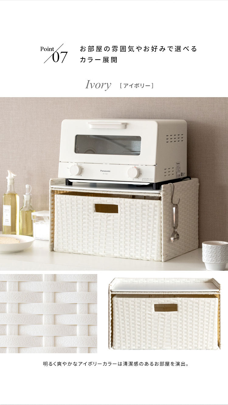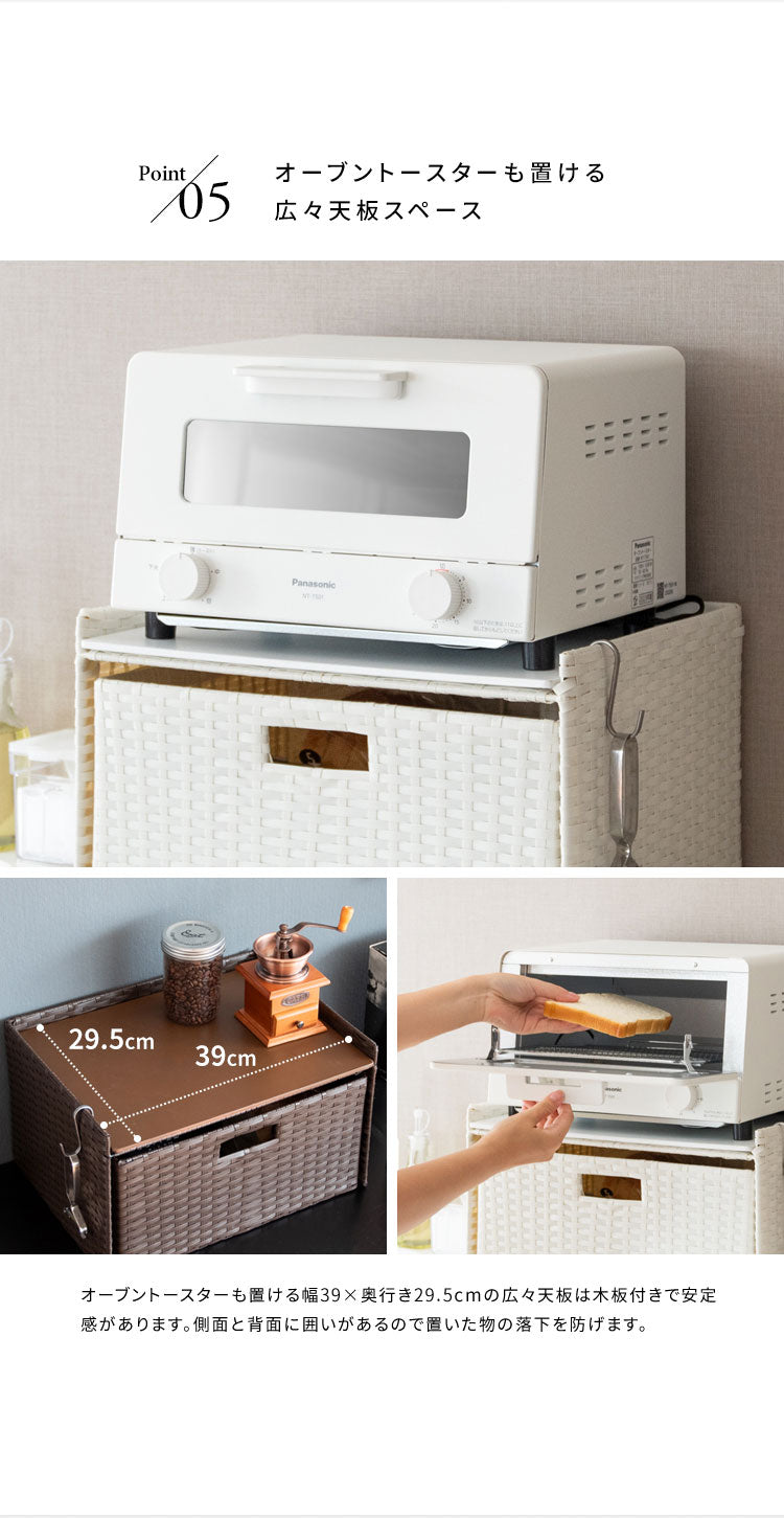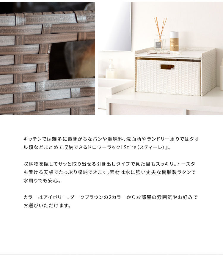 収納物を隠してサッと取り出せる引き出しタイプで見た目もスッキリ。トースタも置ける天板でたっぷり収納できます。素材は水に強い丈夫な樹脂製ラタンで水周りでも安心。