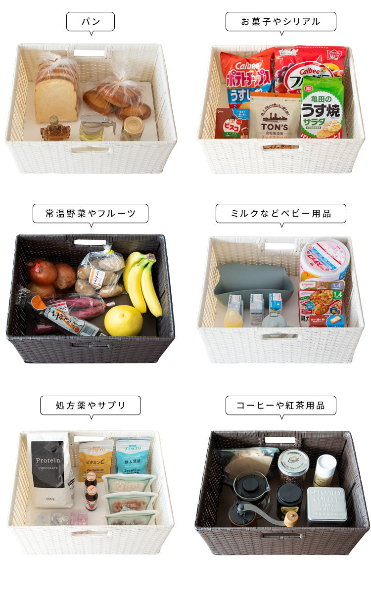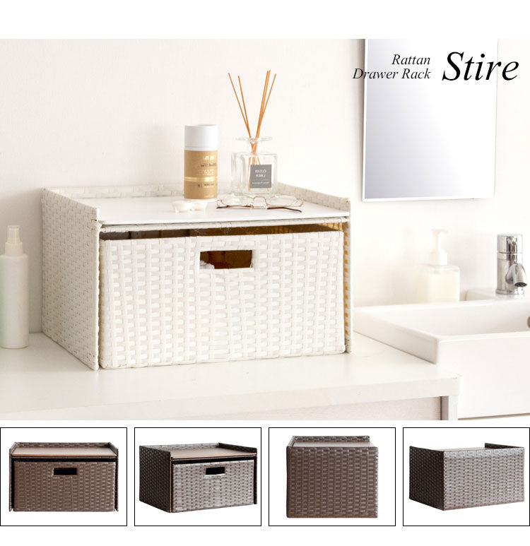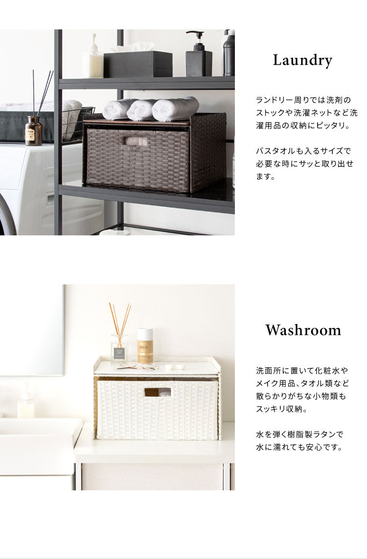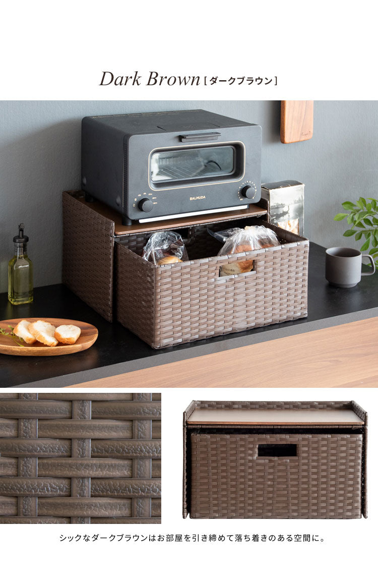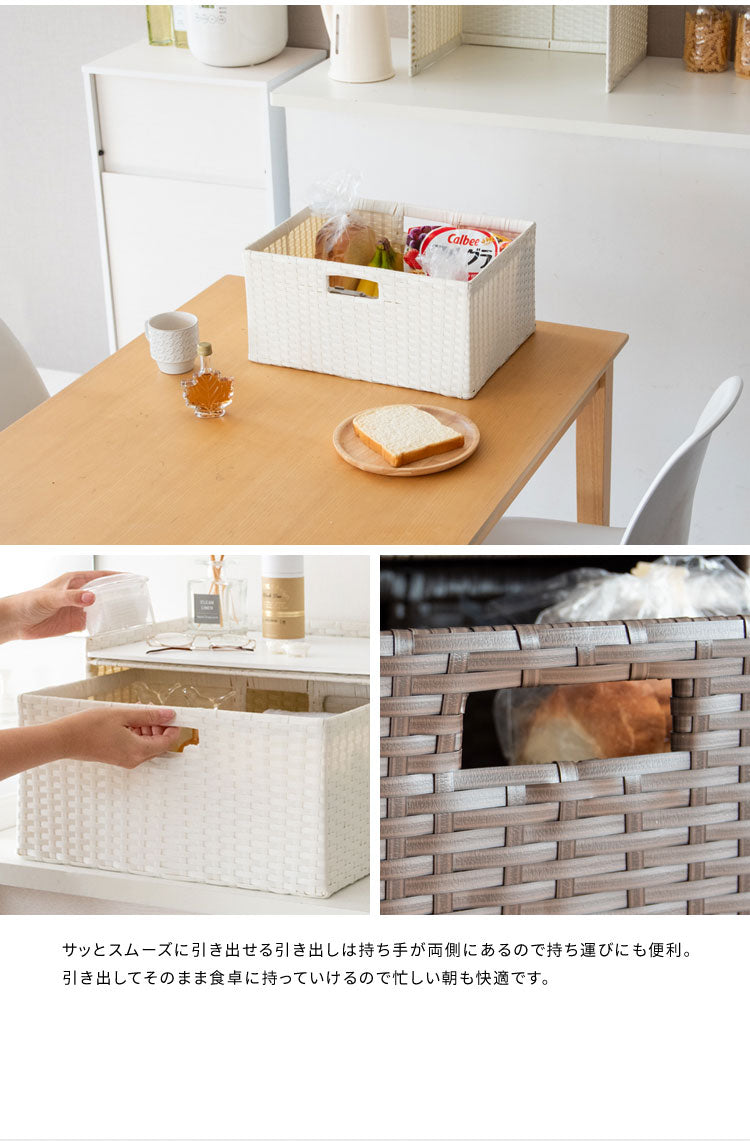 収納物を隠してサッと取り出せる引き出しタイプで見た目もスッキリ。トースタも置ける天板でたっぷり収納できます。素材は水に強い丈夫な樹脂製ラタンで水周りでも安心。