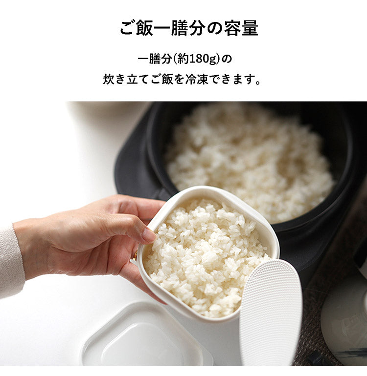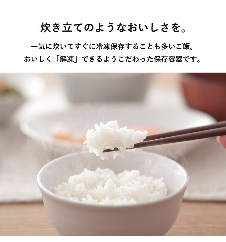 ■全米販・お米マイスター徳永真悟氏共同企画。冷凍ご飯をムラなくふっくらと温められるかたちを極めた保存容器です。お手入れしやすく、収納性の良いシンプルなデザインです。