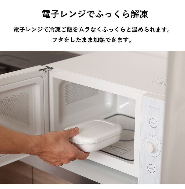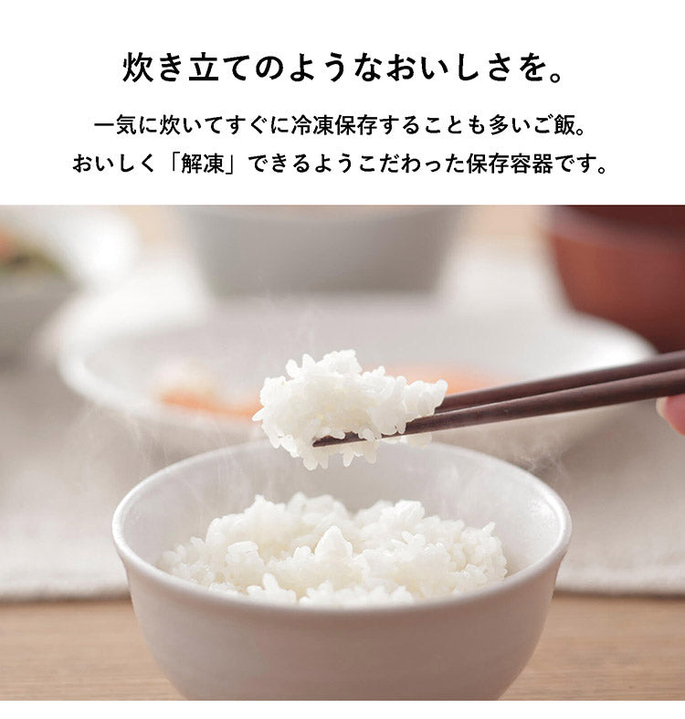 ■全米販・お米マイスター徳永真悟氏共同企画。冷凍ご飯をムラなくふっくらと温められるかたちを極めた保存容器です。お手入れしやすく、収納性の良いシンプルなデザインです。