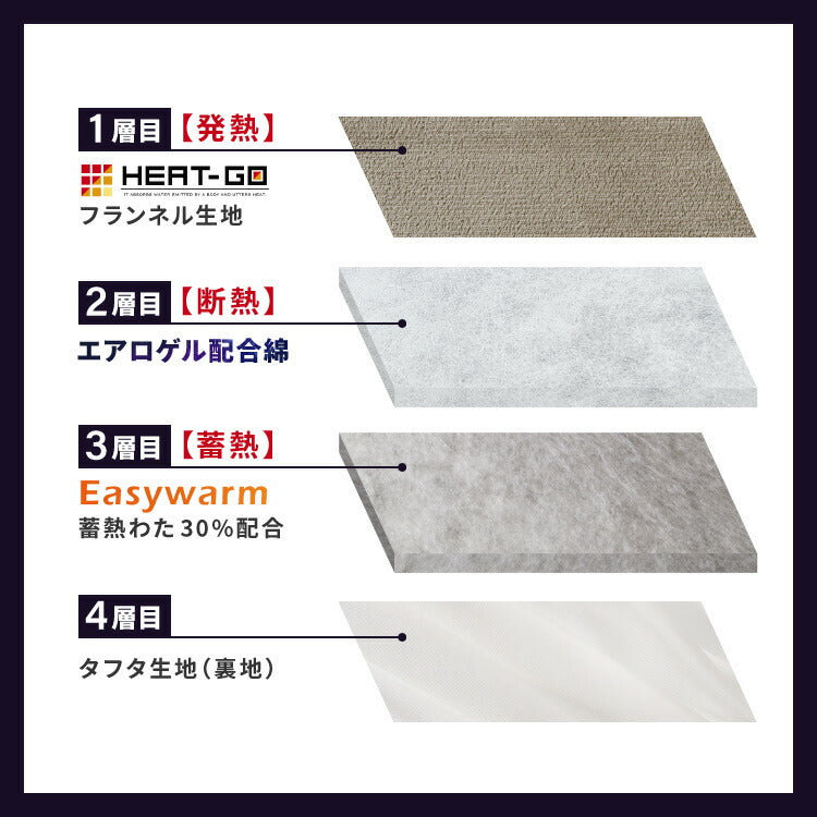側生地に吸湿発熱生地のHEAT-GOフランネル生地を使用して保温力が格段UP。