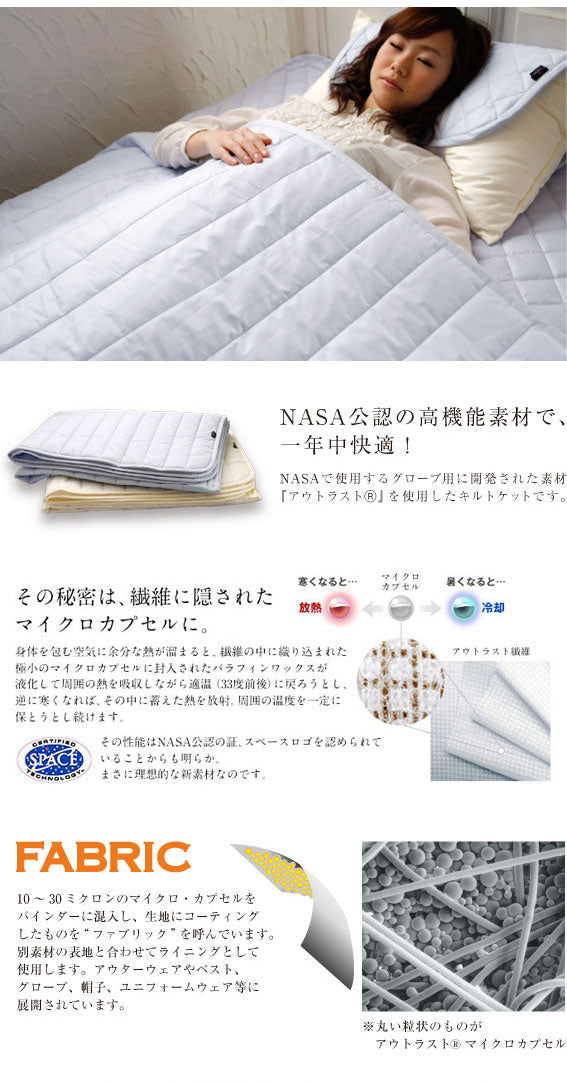 ・NASAで使用するグローブ用に開発された素材、アウトラストを使用したキルトケットです。