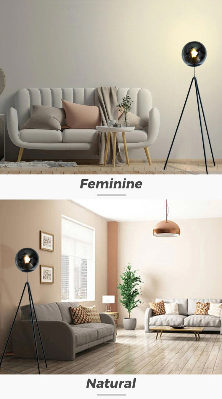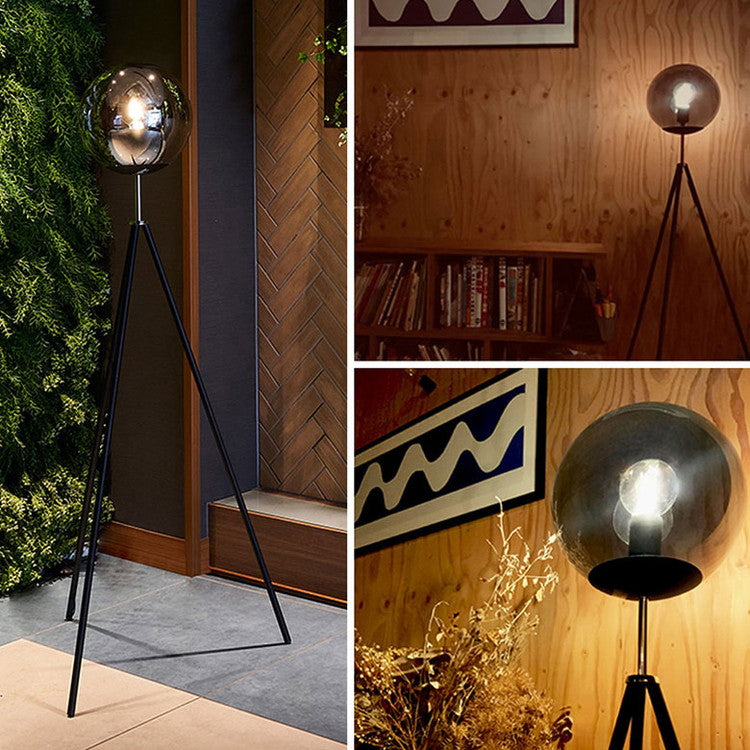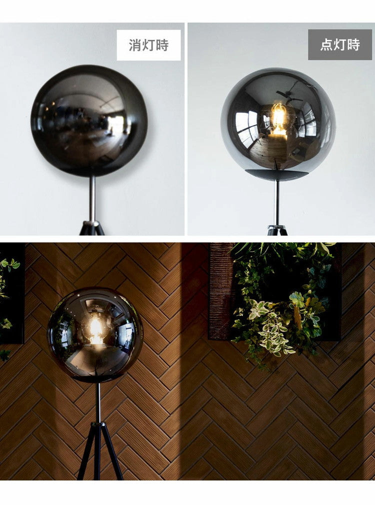 ガラスボールとどこでも設置できる三脚の組み合わせ。スモークグラスを使ったガラスボールは光が直接当たらないので光がやわらかくCORSAVYよりも明るさではなくムードを作る照明としての立ち位置です。