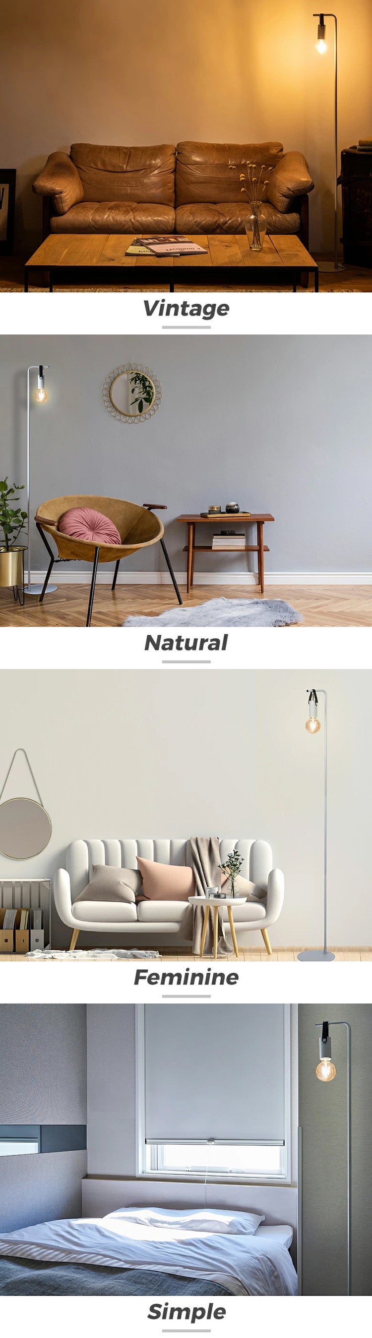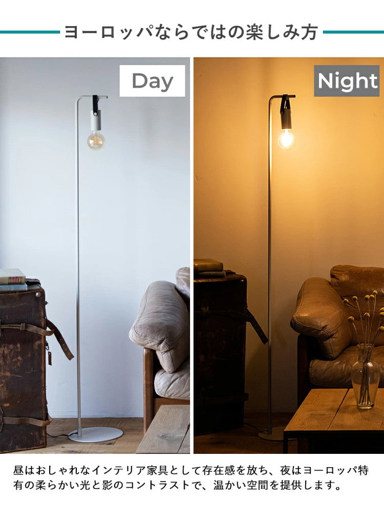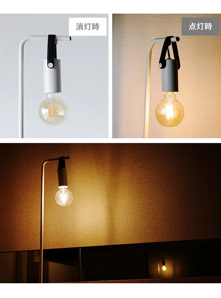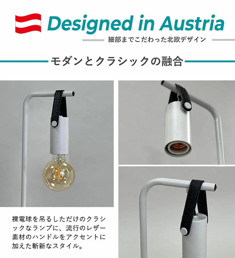 簡略された支柱部分やソケットにくわえ、唯一のアクセントとなるレザーのハンドルが品をもたせ自然なやさしさをあたえてくれています。北欧インテリアに合う素朴でカジュアルなデザインです。